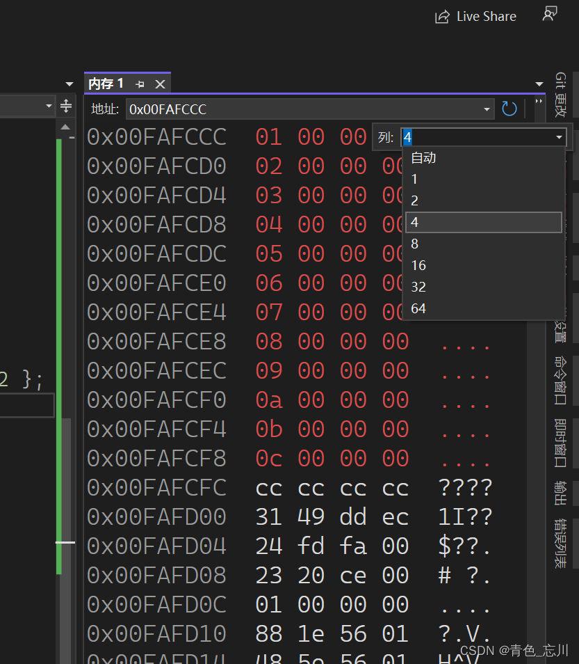 对于内存这个窗口我们需要知道的是,这个位置可以修改一列有几个字节,这个由自己随心所欲的进行设置,我们设置成4个字节是因为他是一个整型数组,易于观察。