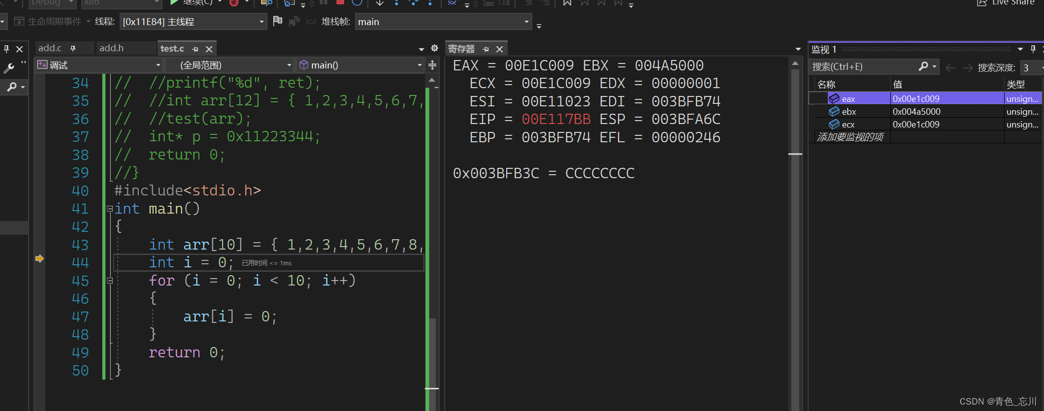 当然在这块可能有人不太理解寄存器和反汇编的这些窗口,这些东西我们将在后面的函数栈帧的创建与销毁中进行涉及