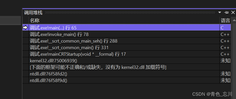 这些是什么意思呢?其实这是我们vs在调用main函数的时候还做了一些准备,也就是先调用了mainCRTStartup(void * __formal)这个函数,然后这个函数调用了__scrt_common_main() 这个函数,接着这个函数又调用了 __scrt_common_main_seh()这个函数,然后这个函数又调用了invoke_main() 这个函数,最后这个函数才调用了main函数