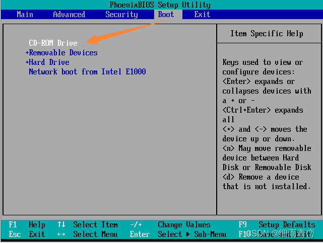 10. 然后进了BIOS界面,将 CD-ROM Drive 升到最高这一步其实可以不做,因为磁盘为空,没有操作系统,他会依序遍历boot目录下的所有设备,直至找到系统