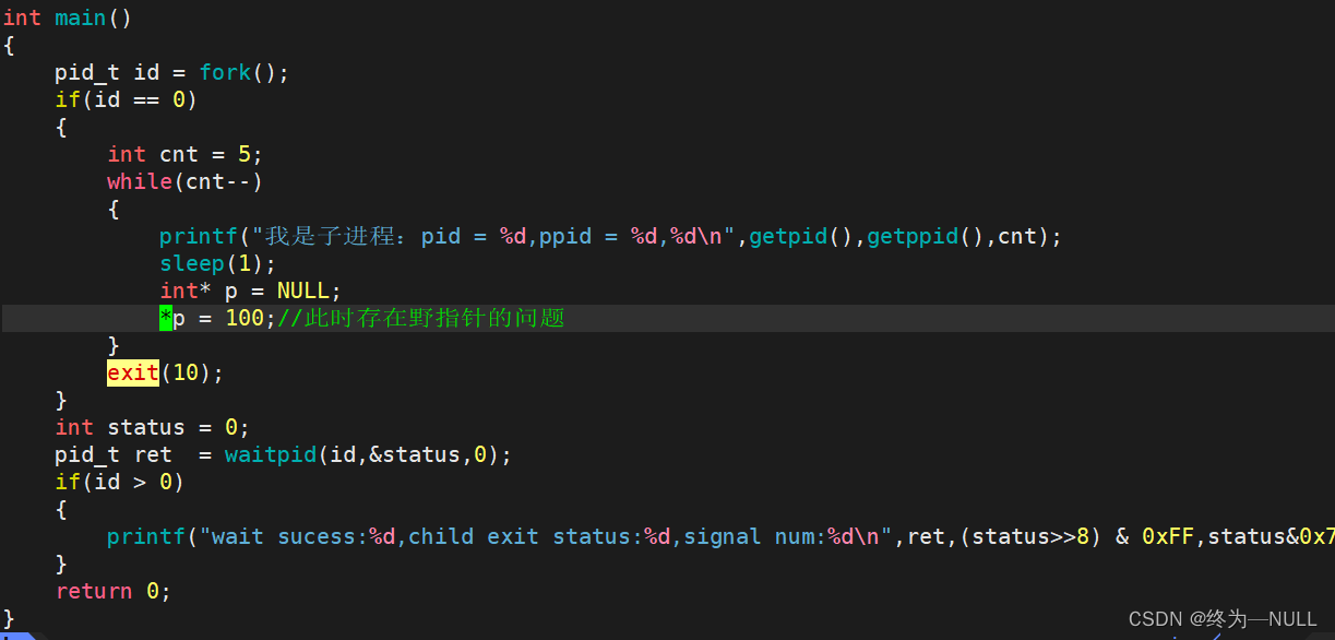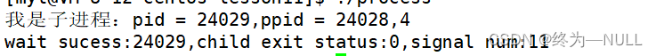 当进程中存在野指针的问题时,进程异常,被操作系统终止,终止信号就为11代表段错误,而我们的进程也没有正常运行完,所以status也没有获取到次8位的值,我们默认异常终止状态信息设置为0