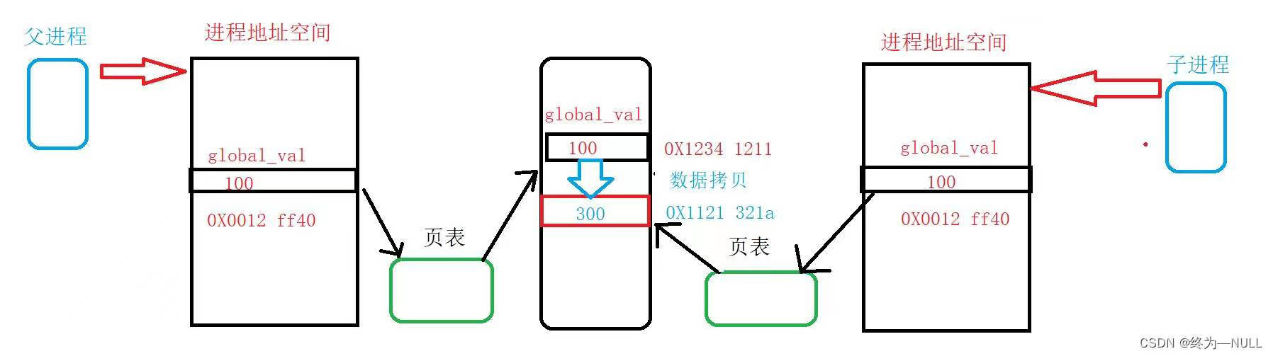 通常,父子代码共享,父子再不写入时,数据也是共享的,当任意一方试图写入,便以写时拷贝的方式各自一份副本。