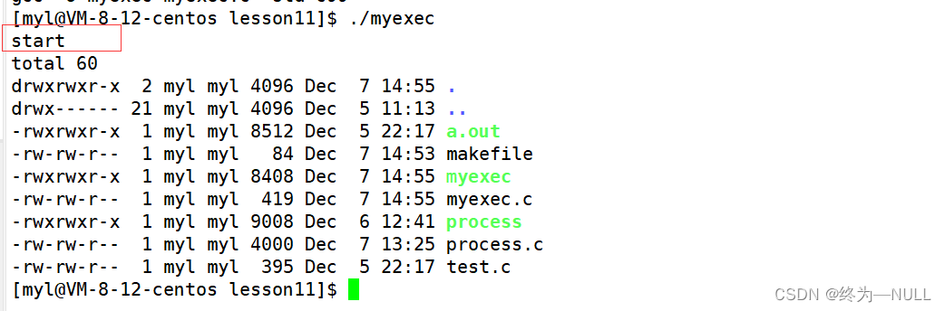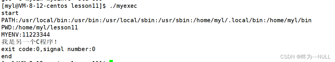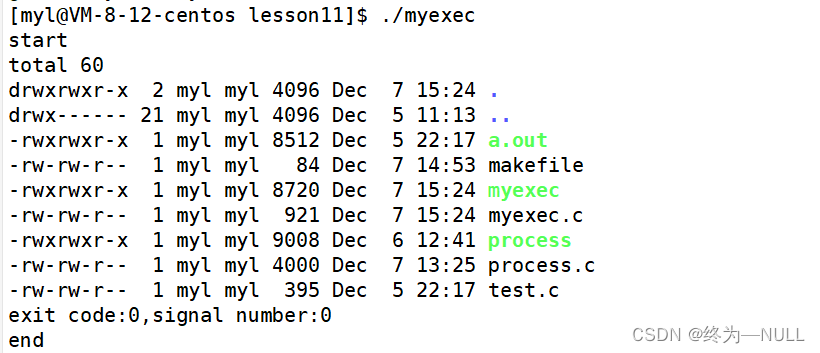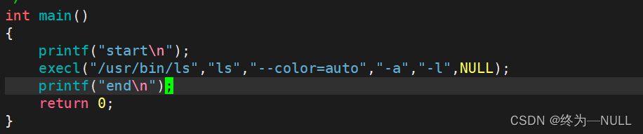 运行发现,输出了start,但是没有输出end,说明在调用execl函数之后,原来进程的代码和数据被覆盖了