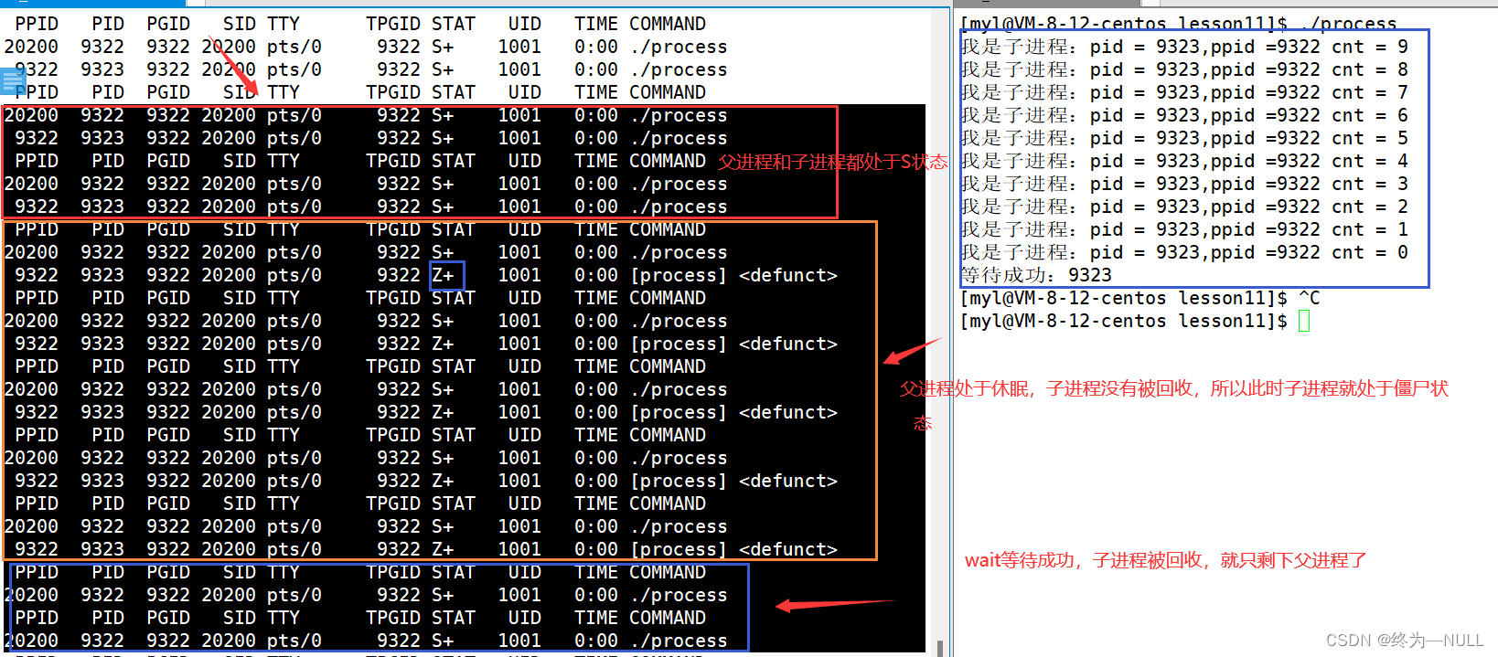 验证父进程回收子进程的过程:
