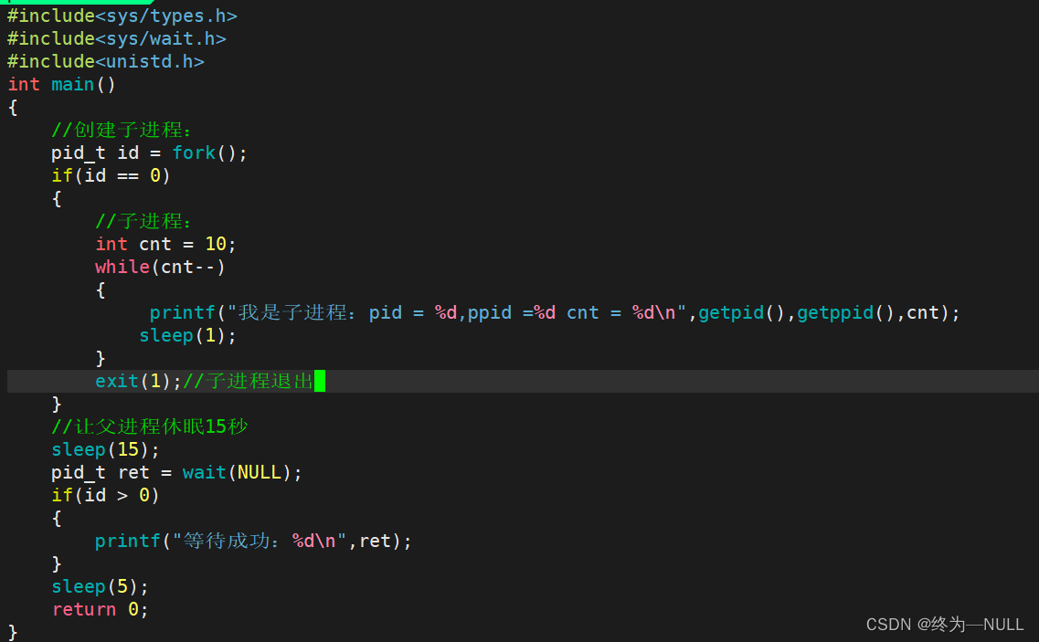 这段代码的含义是:用fork创建子进程,然后让子进程跑10秒钟,让父进程休眠15秒,所以中间就会有5秒子进程处于僵尸状态,因为父进程没有回收子进程,5秒后wait等待成功,然后被父进程回收了