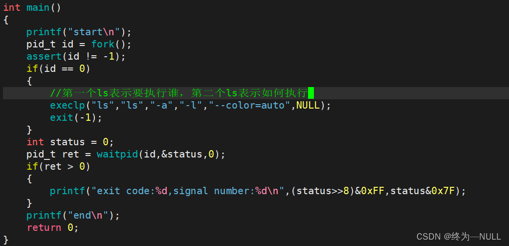 #include` int execl(const char *path, const char *arg, ...); int execlp(const char *file, const char *arg, ...); int execle(const char *path, const char *arg, ...,char *const envp[]); int execv(const char *path, char *const argv[]); int execvp(const char *file, char *const argv[]); 例:通过调用execl这个函数,让我们的进程执行ls这个命令