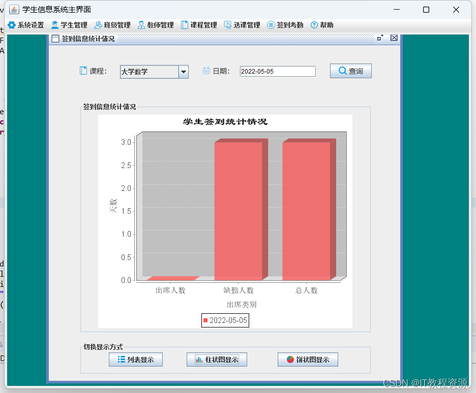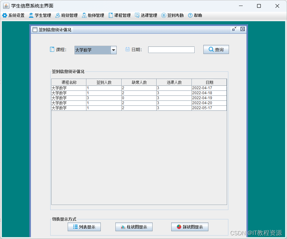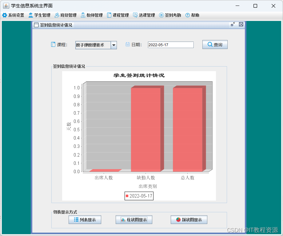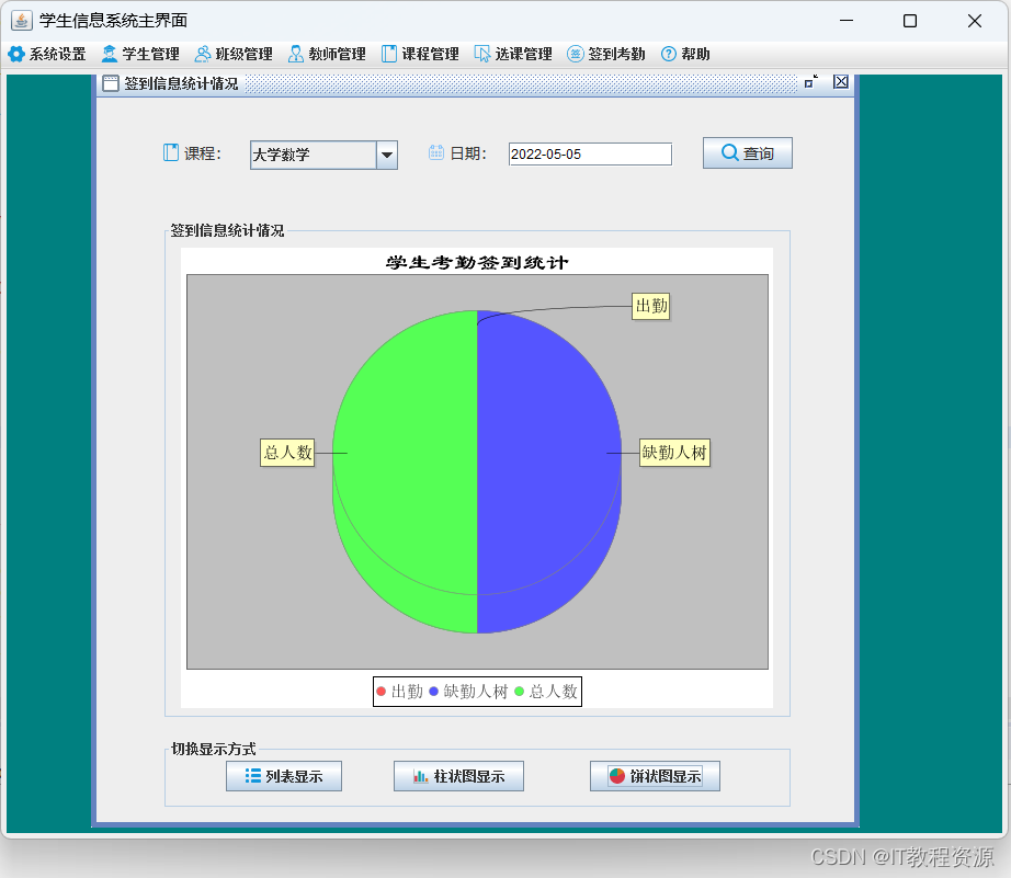 签到统计:列表显示、柱状图显示、饼状图显示