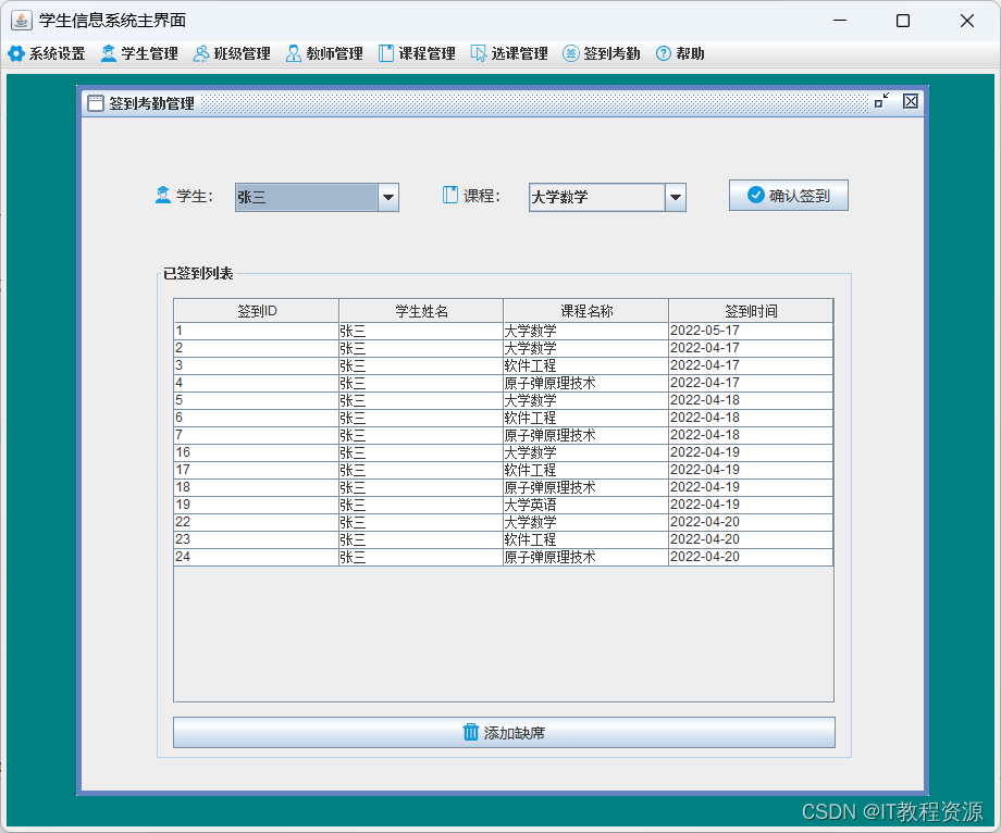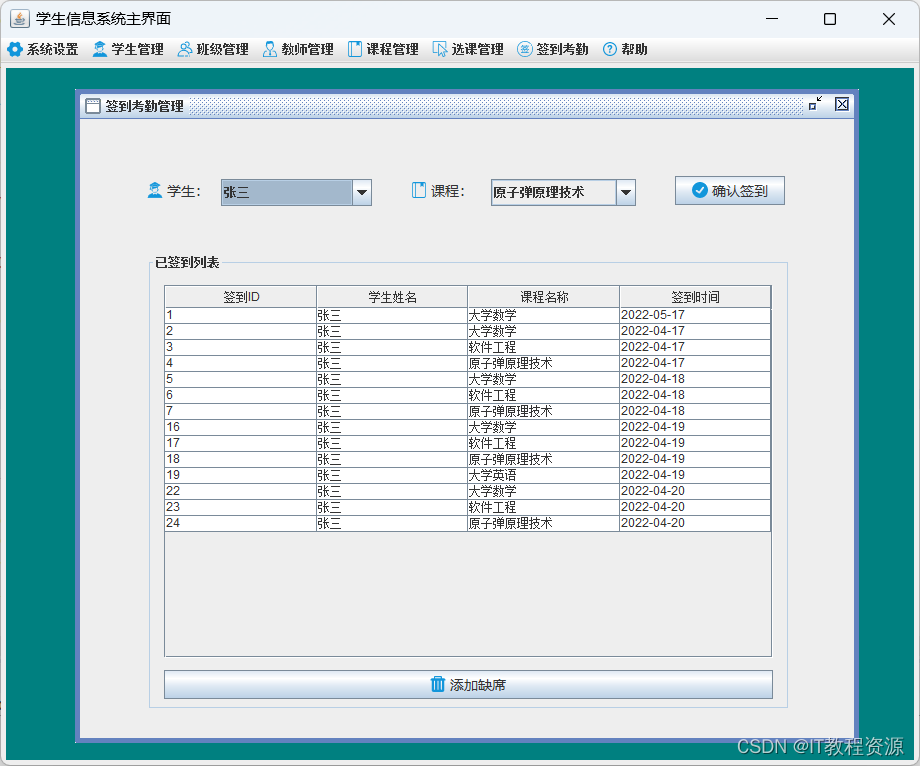 签到管理:确认签到、添加缺席