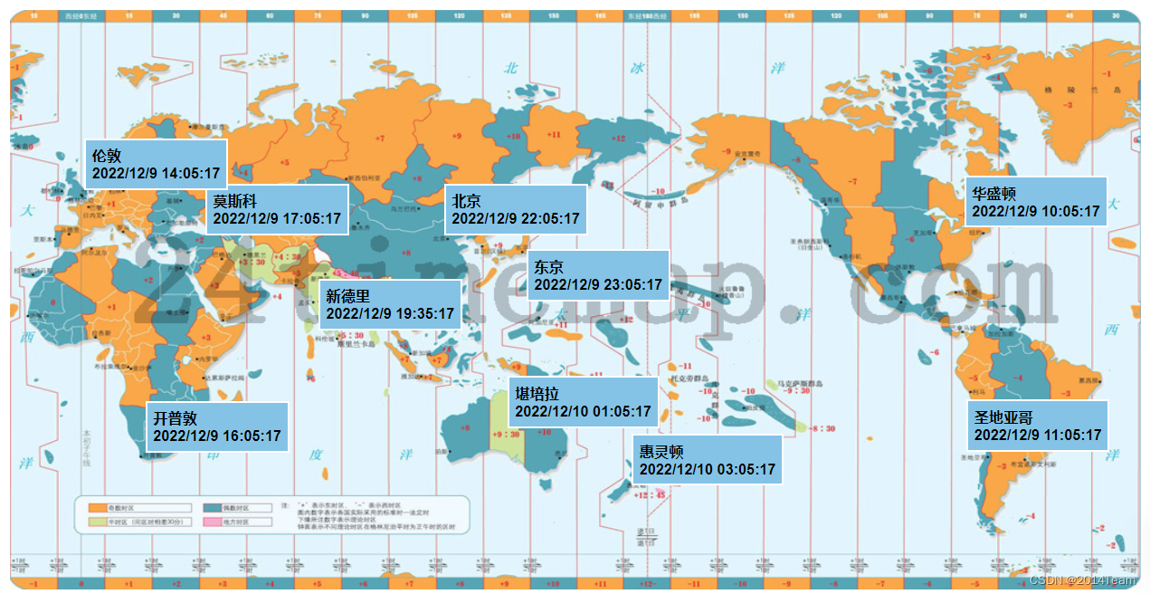 当我们说当前时刻是2022年12月9日晚上21:59的时候,我们说的实际是本地时间。在国内是北京时间。在这个时刻,地球上不同地方的人同时看一眼表,各自的本地时间是不同的。