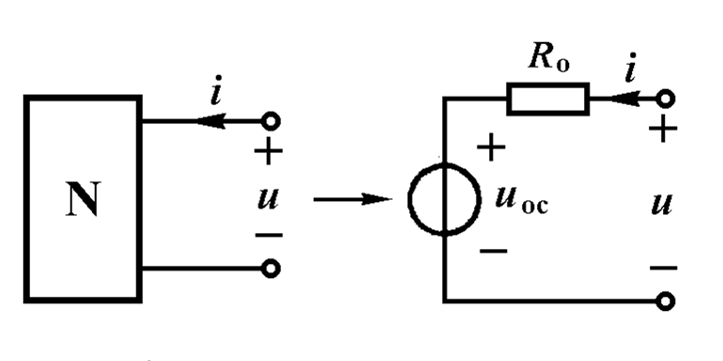 戴维南定理:含独立电源的线性电阻单口网络N,就端口特性而言,可以等效为一个电压源和电阻串联的单口网络。电压源的电压等于单口网络在负载开路时的电压uoc;电阻R0是单口网络内全部独立电源为零值时所得单口网络N0的等效电阻。