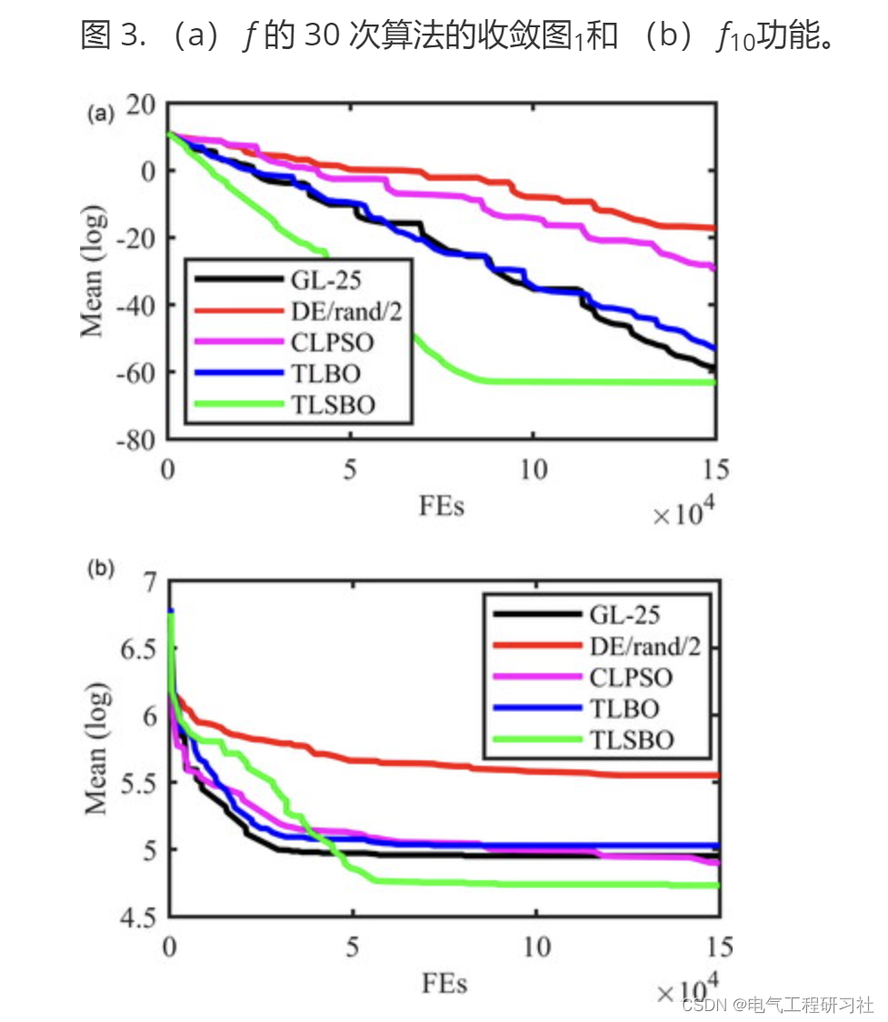在仿真研究的第一部分中,为了验证TLSBO算法在实参数优化方面的性能,选择了各种类型的实参数函数[27]基于平均值(最佳结果的平均值)、最佳(所有运行中的最佳结果)和 Std(最佳结果的标准偏差),这些结果在附录中进行了总结。在本节中,GL-25的特征包括一般性能,坚固性和精度[28], 德国/兰特/2 [29],(F(比例因子)= 0.45,CR(交叉因子)= 0.7),CLPSO [30],使用12个实参数测试函数比较了原始TLBO和提出的TLSBO算法,这些函数总结在[27].实参数测试函数是多模态、不可分离、可扩展的测试函数,它们具有从局部最小值到全局最小值的非常长、窄且抛物线形的谷值,这使得它们很难求解[27].每个算法对每个实参数测试函数运行 30 次,结果包括均值、最佳、标准值表 1.在这些模拟中,总体大小被视为 N = 30,函数评估的最大值 FE = 150,000,维度 D = 30。在此表中,秩显示算法的平均指数逐级排序的顺序,Nb 是该算法优于其他算法的次数,Nw 是该算法比其他算法差的次数,Mr 是所有函数的算法秩的平均值。结果表明,所提出的TLSBO算法在获得更好的最终解和较少收敛到局部最小值方面超越了原来的TLBO等算法。结果表明,TLSBO算法成功解决了不同的实参数优化问题。f 的 30 次算法运行的收敛图的均值1和 f10测试函数如图 3 所示。