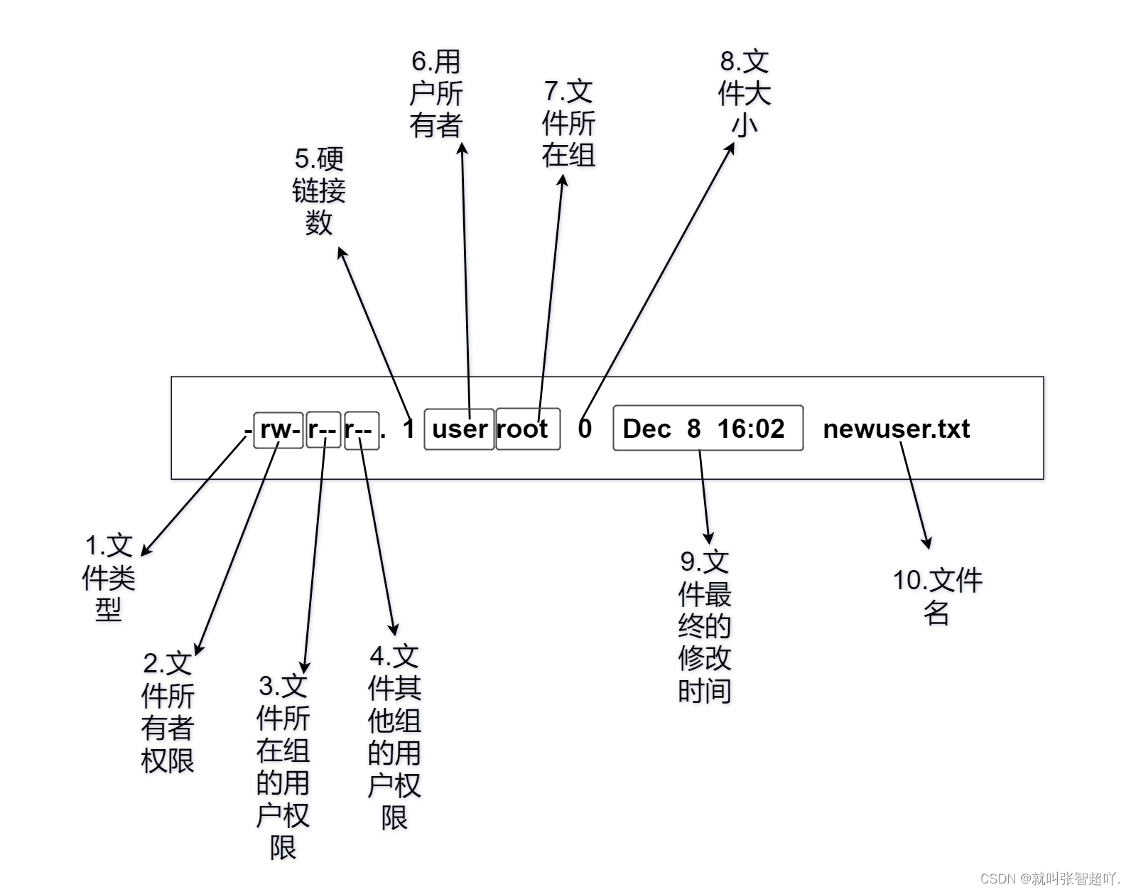 (2、3、4所看到的权限:rwx:读、写和执行权限、rw-:读写权限、r--:只读权限)