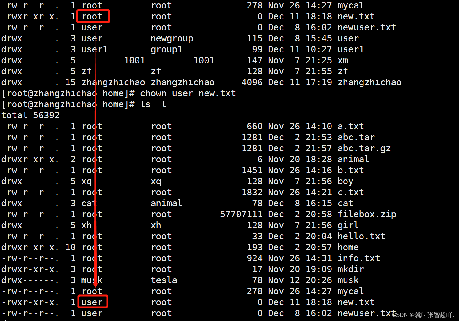2.请将 /home/zzc目录下所有的文件和目录的所有者都修改成user