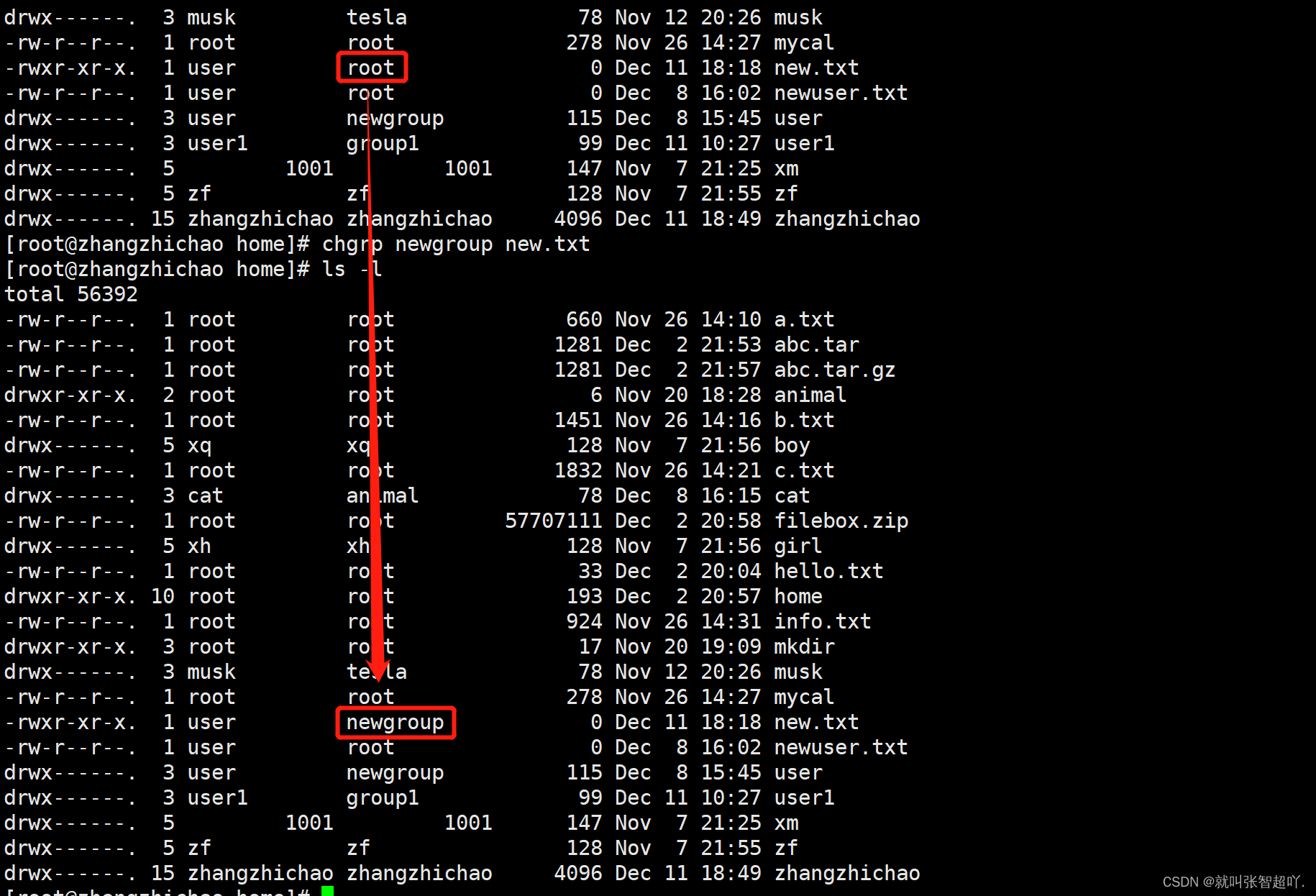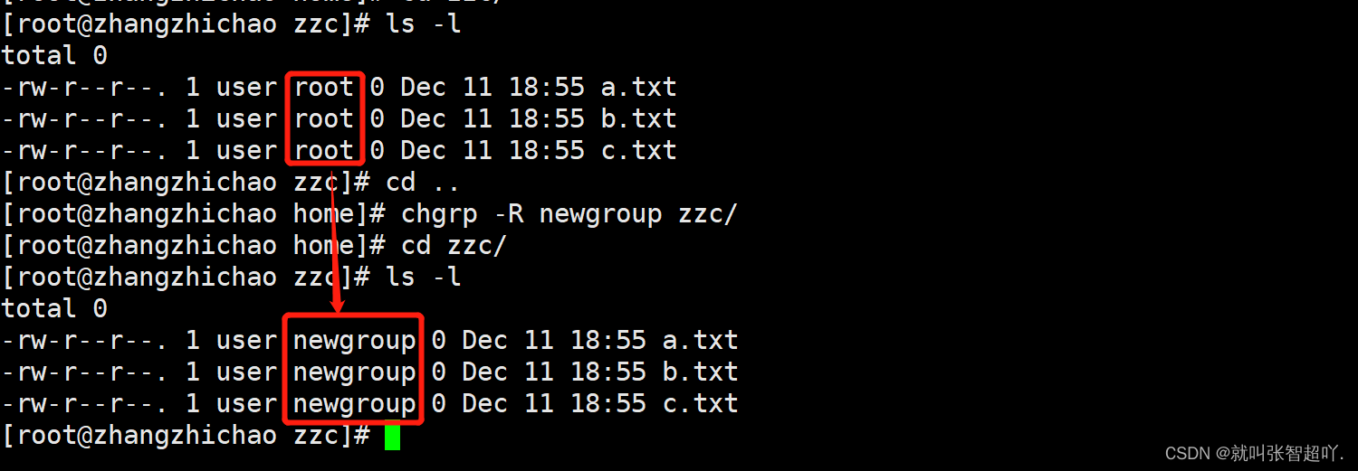 2.请将 /home/zzc目录下所有的文件和目录的所在组都修改成newgroup