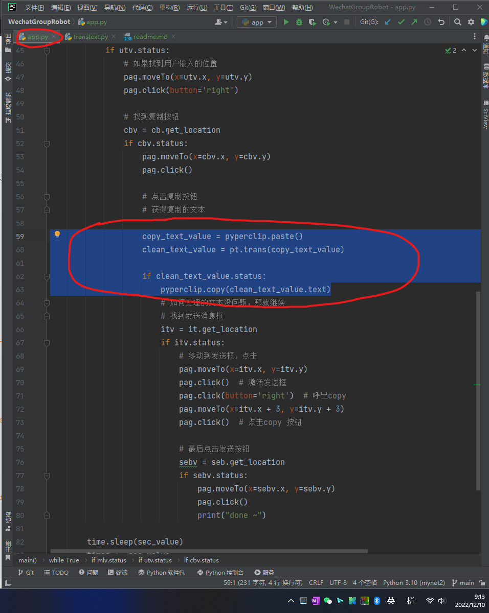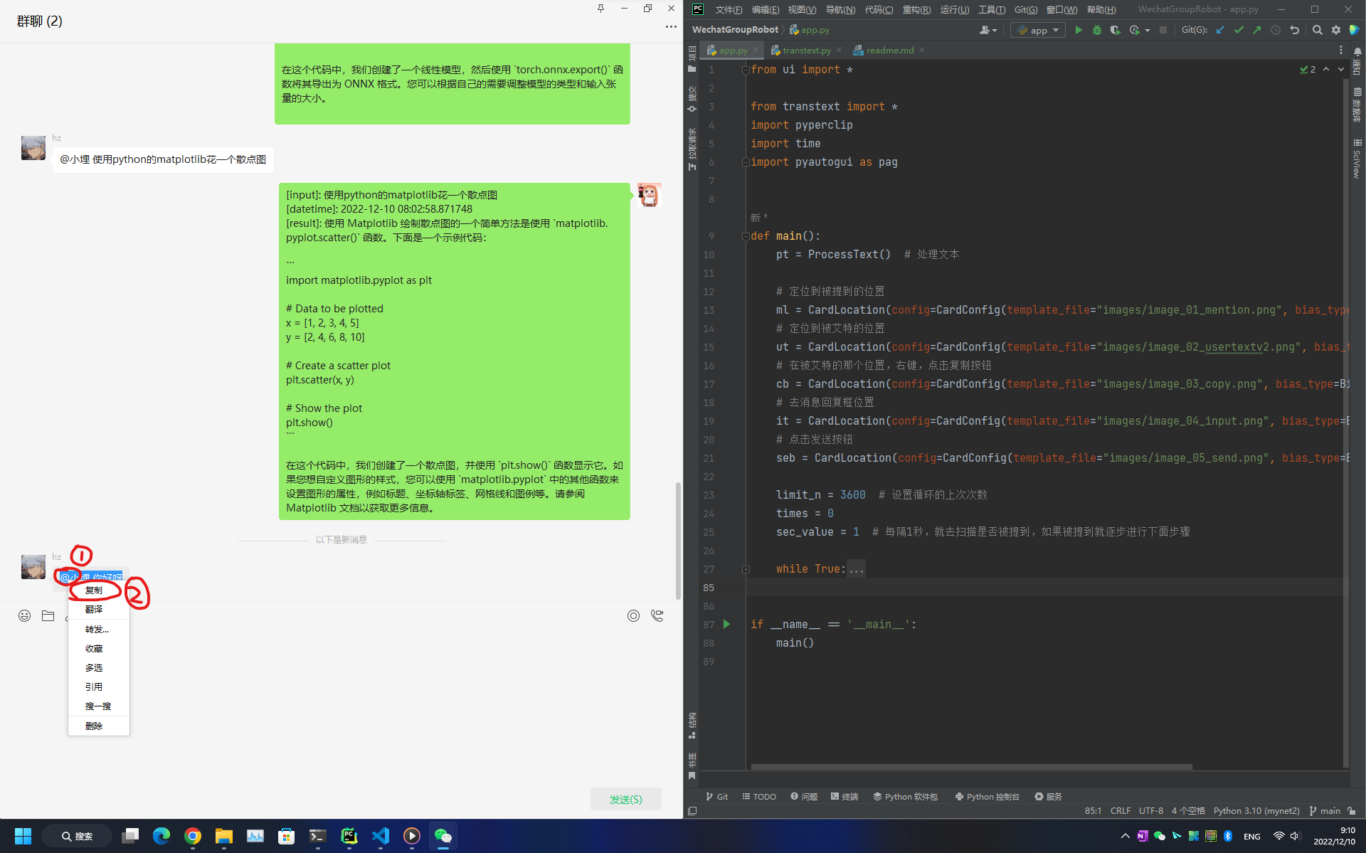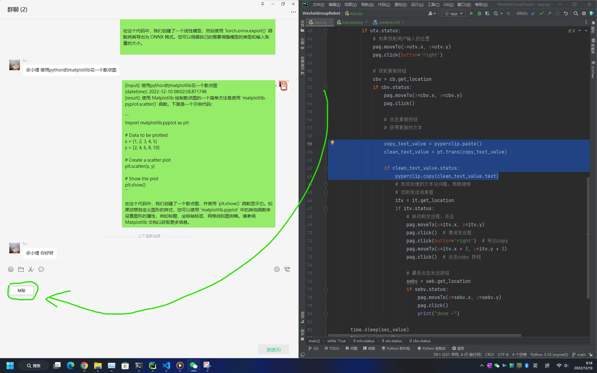 复制后的文本,会被从剪切板传递到python里面,然后python调用机器人接口,得到新内容,将新内容再次传递到剪切板