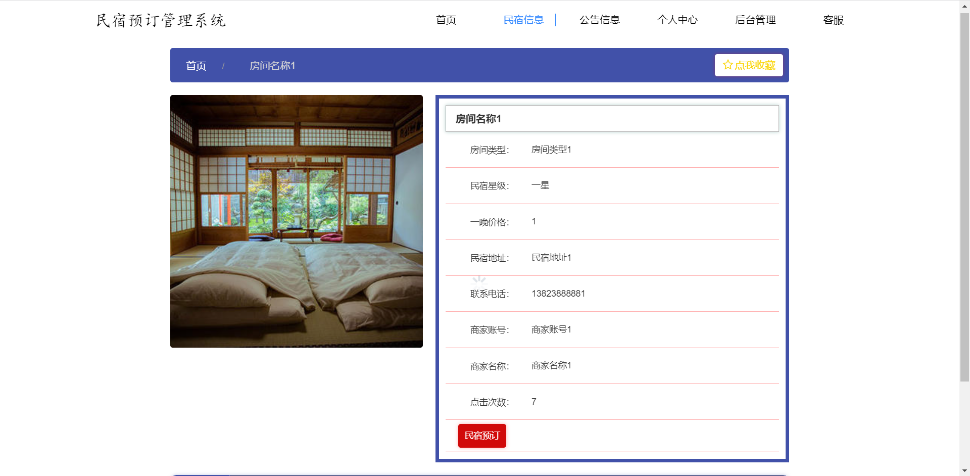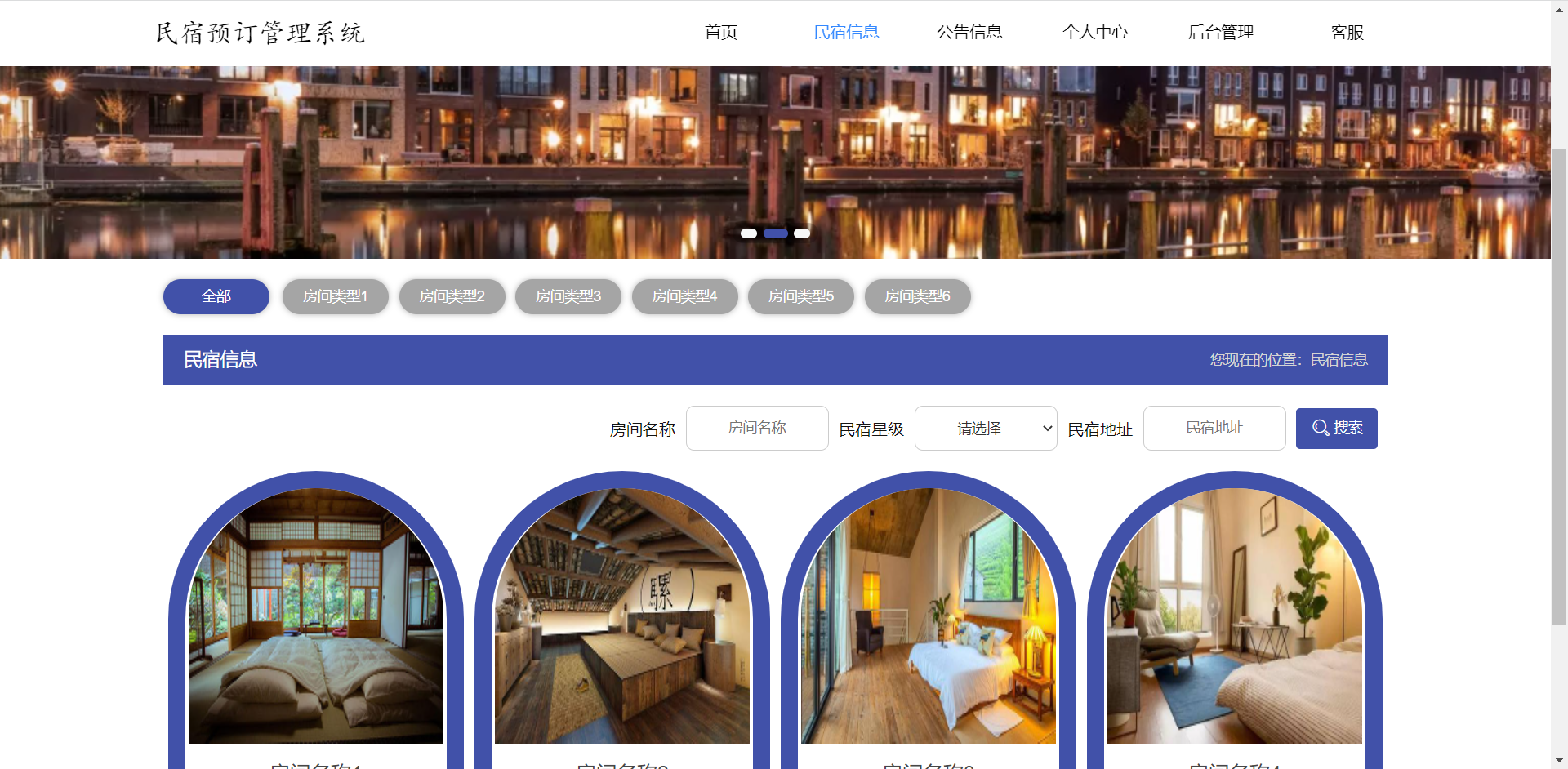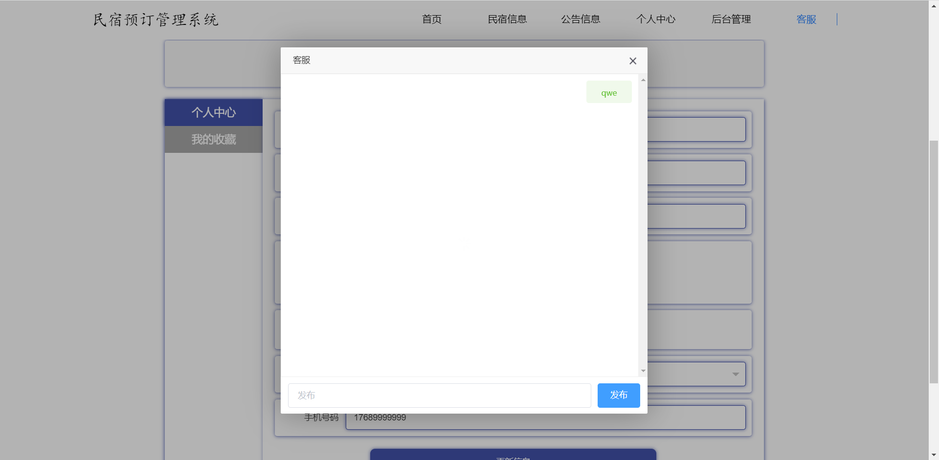 前台:首页、民宿信息、公告信息、个人中心、后台管理、客服等