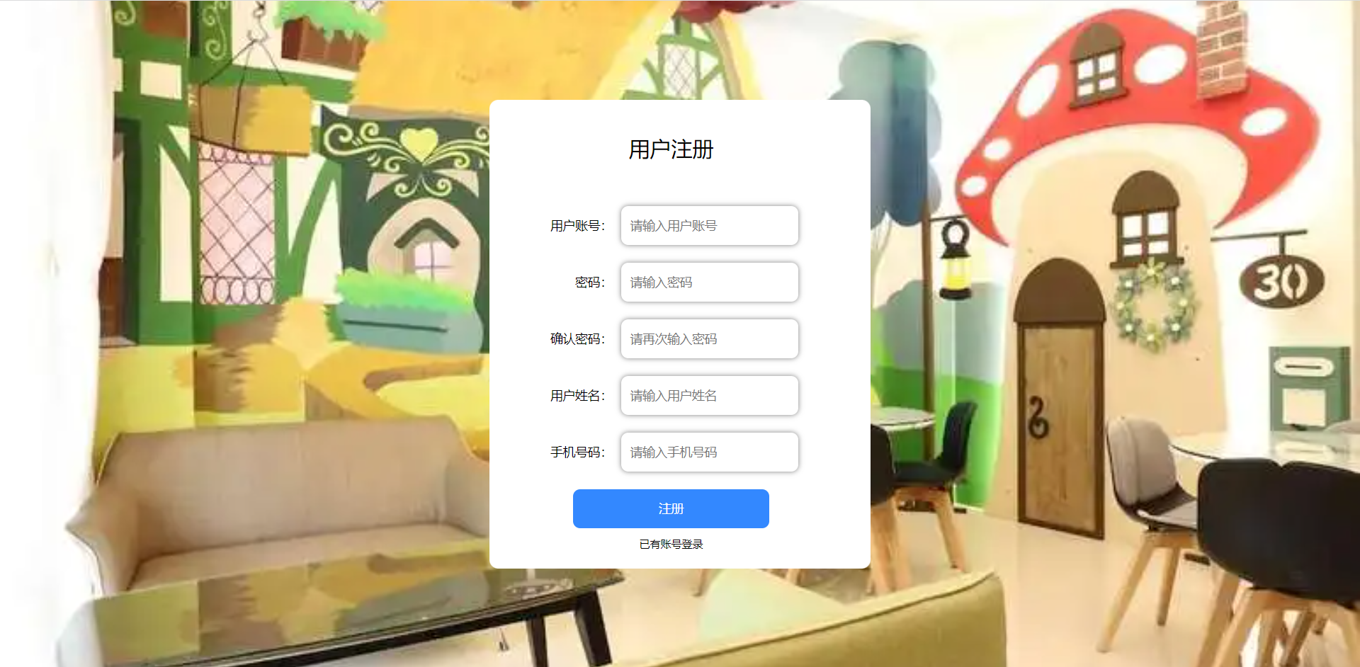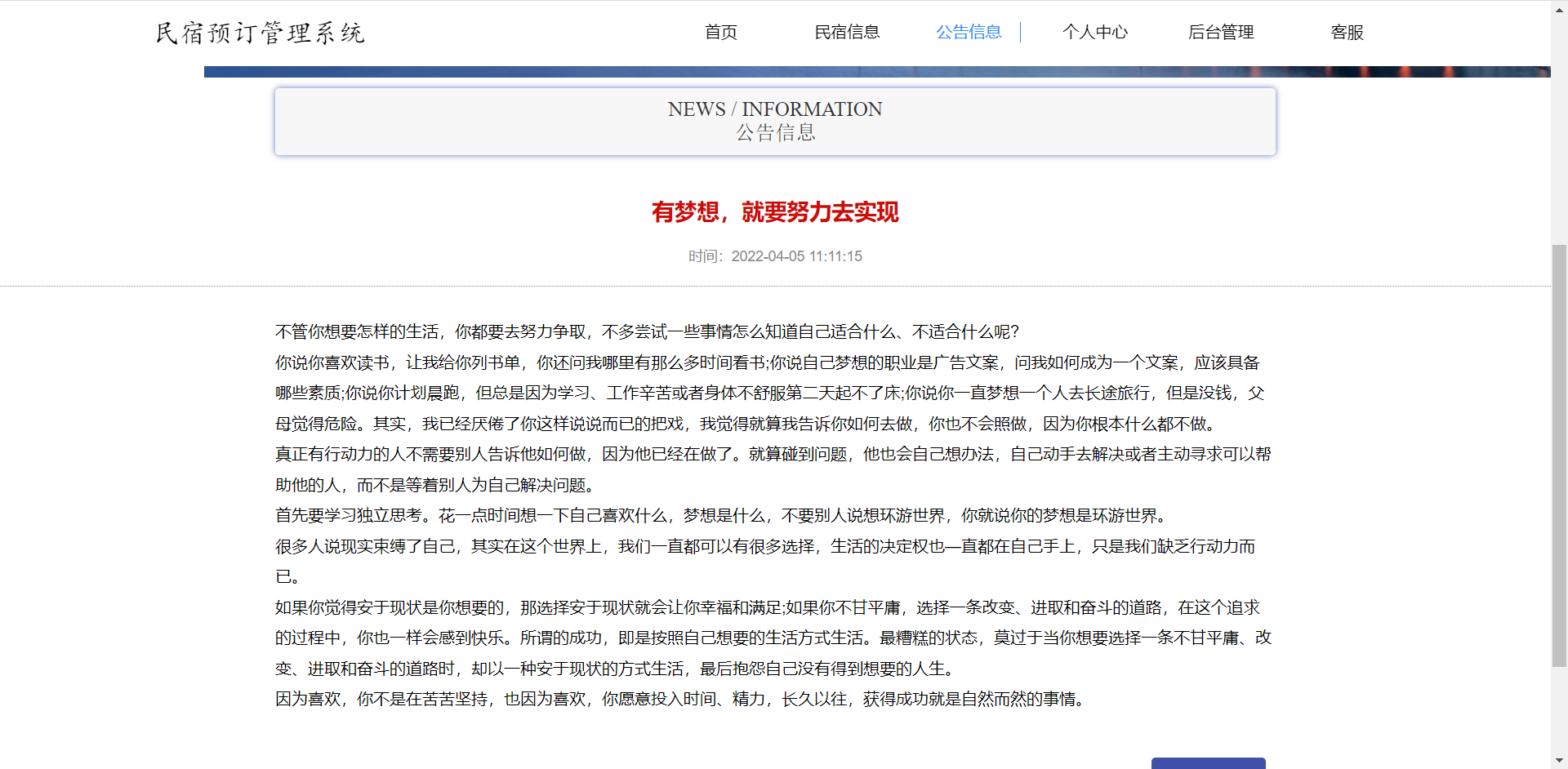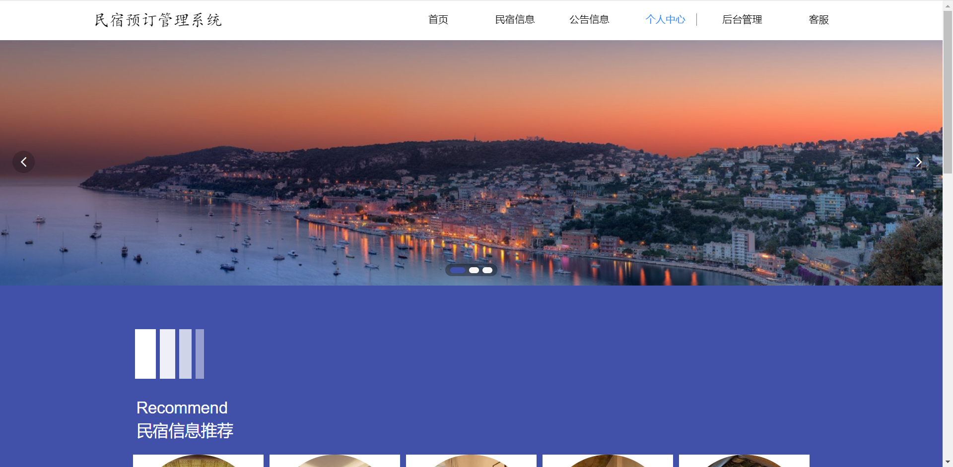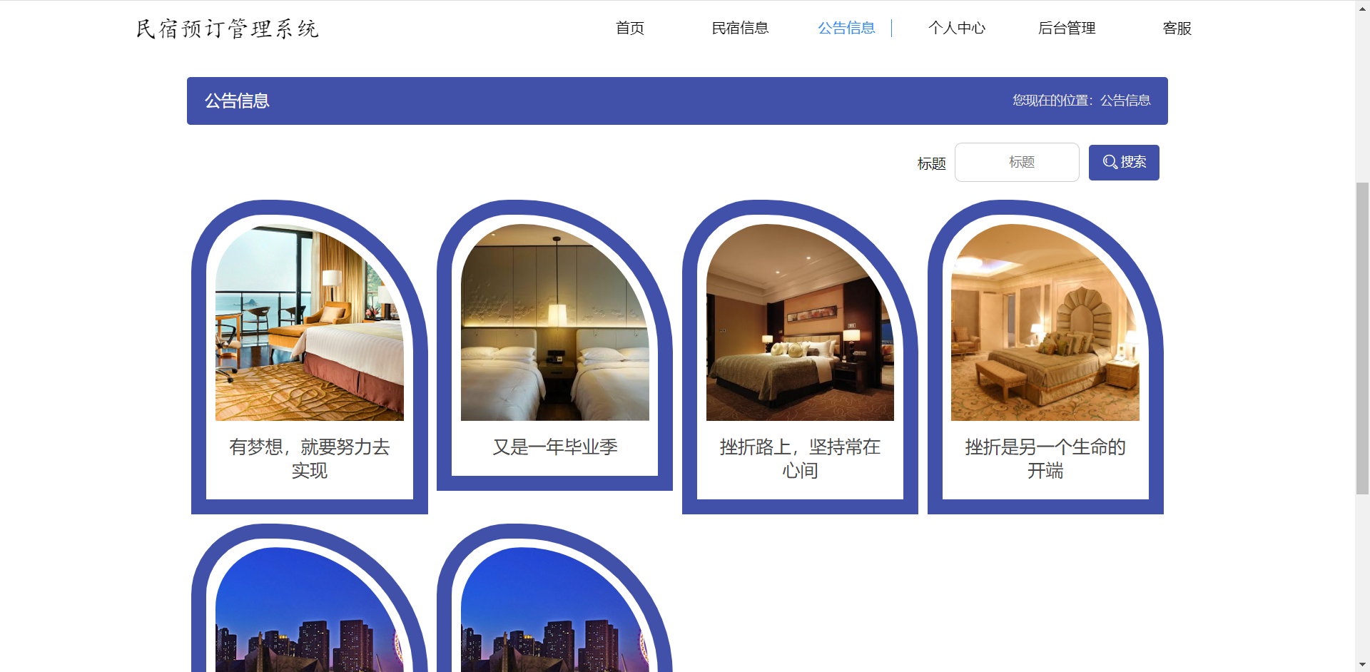 前台:首页、民宿信息、公告信息、个人中心、后台管理、客服等