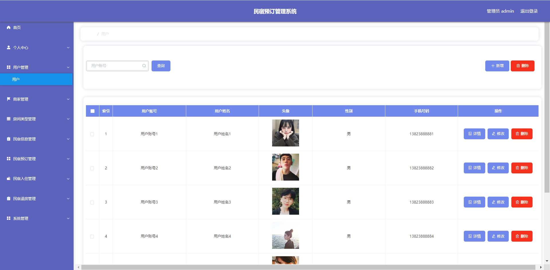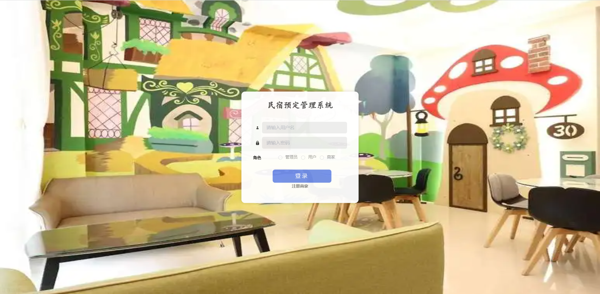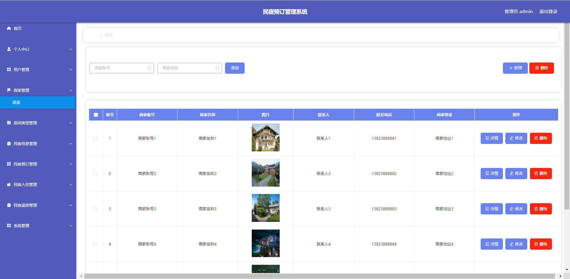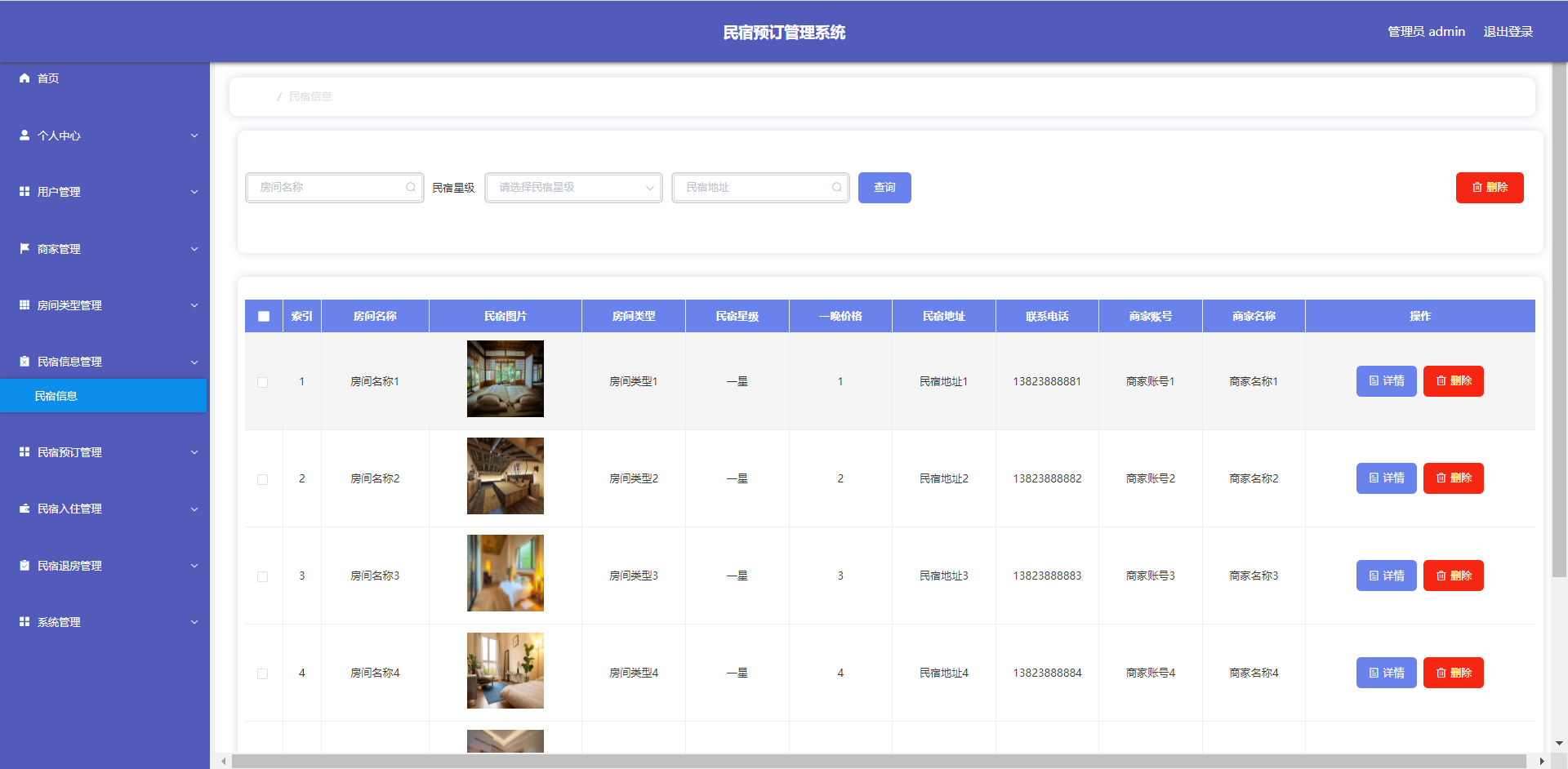 管理员:首页、个人中心、用户管理、商家管理、房间类型管理、民宿信息管理、民宿预订管理、民宿入住管理、民宿退房管理、系统管理等
