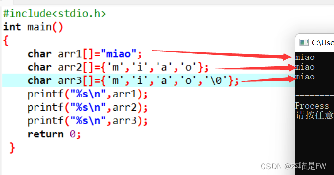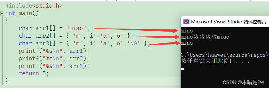 {char arr1[]="miao";char arr2[]={'m','i','a','o'};char arr3[]={'m','i','a','o','\0'};printf("%s\n",arr1);printf("%s\n",arr2);printf("%s\n",arr3);return 0;}