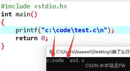 例如我们打印c:\code\test.c\n,看看效果吧!