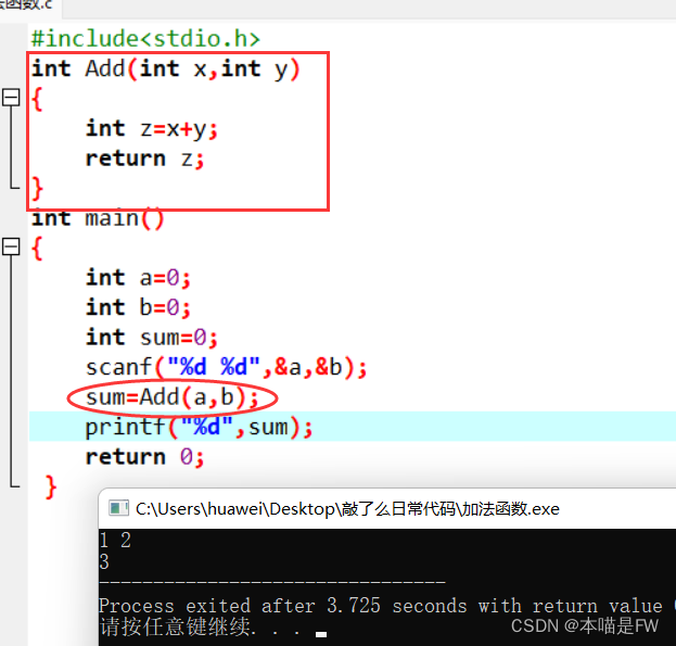 函数的特点是简化代码,代码重复使用,减小主函数的“压力”,分成各部分更利于检查!