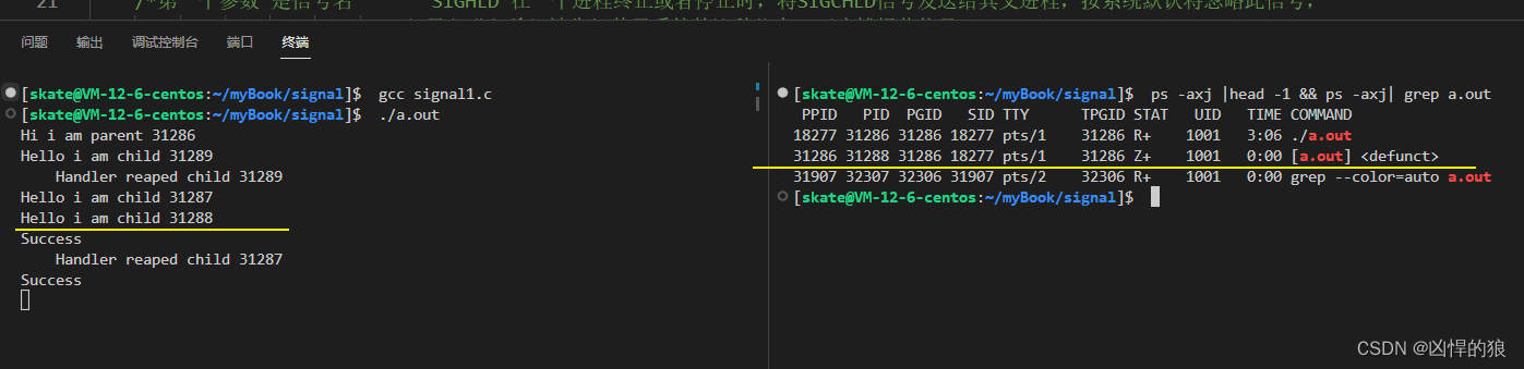 这里我们注意到尽管发送了3个SIGCHLD信号给父进程,但其中只有两个信号被成功接收了,因此父进程只回收了两个子进程.而子进程31288则成为了一个僵尸进程.