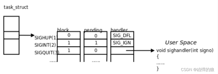 - 每个信号都有两个标志位分别表示阻塞(block)和未决(pending),还有一个函数指针表示处理动作。信号产生时,内核在进程控制块中设置该信号的未决标志,直到信号递达才清除该标志。在上图的例子中,SIGHUP信号未阻塞也未产生过,当它递达时执行默认处理动作。