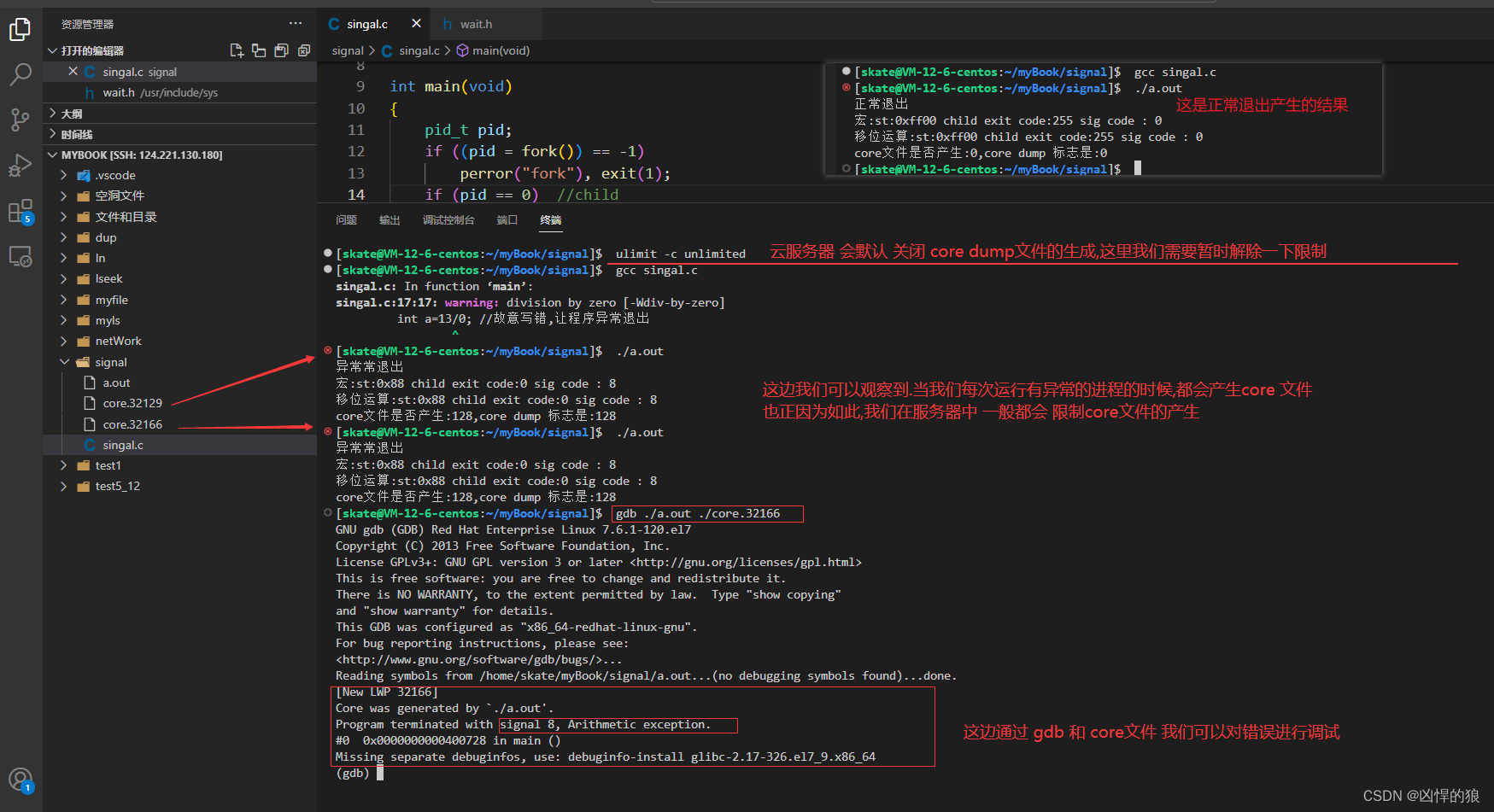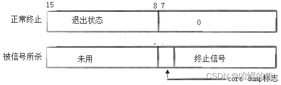 {pid_t pid;if ((pid = fork()) == -1)perror("fork"), exit(1);if (pid == 0) //child{sleep(4);int a=13/0; //故意写错,让程序异常退出exit(0xFF);}else{int st;int ret = wait(&st);// if(ret > 0 &&WIFEXITED(st) ) WIFEXITED(st)进程正常退出为真,和下面等价if (ret > 0 && (st & 0X7F) == 0){ // 正常退出printf("正常退出\n");printf("宏:st:%p child exit code:%d sig code : %d \n",st,WEXITSTATUS(st),WTERMSIG(st));printf("移位运算:st:%p child exit code:%d sig code : %d\n",st,(st >> 8) & 0XFF,st & 0X7F);printf("core文件是否产生:%d,core dump 标志是:%d\n",WCOREDUMP(st),st & 0X80);}else if (ret > 0){ // 异常退出printf("异常常退出\n");printf("宏:st:%p child exit code:%d sig code : %d \n",st,WEXITSTATUS(st),WTERMSIG(st));printf("移位运算:st:%p child exit code:%d sig code : %d\n",st,(st >> 8) & 0XFF,st & 0X7F);printf("core文件是否产生:%d,core dump 标志是:%d\n",WCOREDUMP(st),st & 0X80);//core会输出128,因为它刚好在第8位 ,即0X80}}