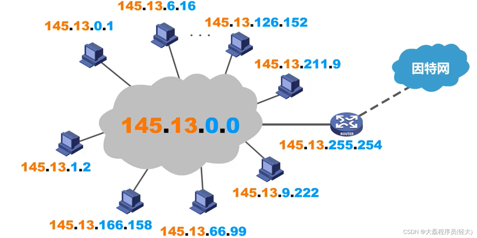 如图:某单位有一个大型的局域网需要连接到因特网。申请了一个B类的网络地址,因此分配IP地址的数量达到了65534个,给每台计算机和路由器的接口分配一个IP地址后,还有大量IP地址剩余,这些剩余的IP地址只能由该单位的同一个网络使用,而其他单位的网络不能使用。