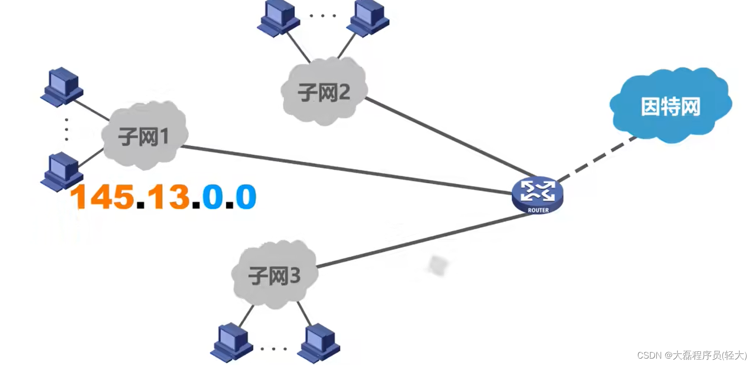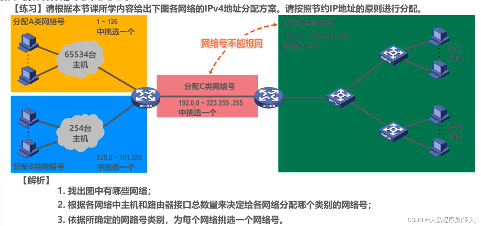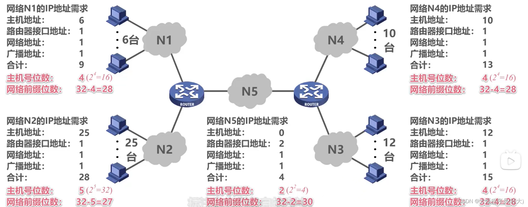 个子网,其中n是从主机号部分借用的用来作为子网号的比特数量。每个子网所分配的IP数量相同,例如图中的网络5只需要4个IP地址 ,但是我们给它分配了32个IP地址,这样就造成了IP地址的严重浪费。