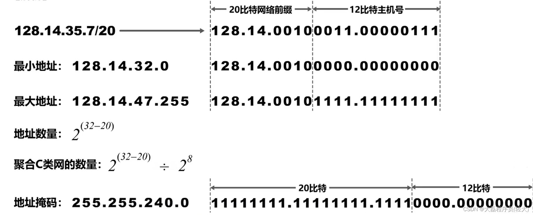 【例1】请给出CIDR地址块128.14.35.7/20的全部细节(最小地址,最大地址,地址数量,聚合C类网数量,地址掩码)。