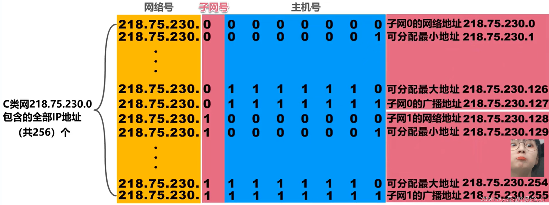 【举例】已知某个网络的地址是 218.75.230.0,使用子网掩码255.255.255.128对其进行子网划分,请给出划分细节。