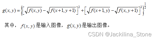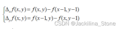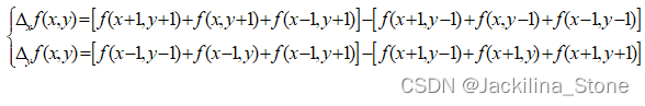 Roberts边缘算子是一个2x2的模板,采用的是对角方向相邻的两个像素之差。用差分代替一阶偏导,算子表示如下公式所示。