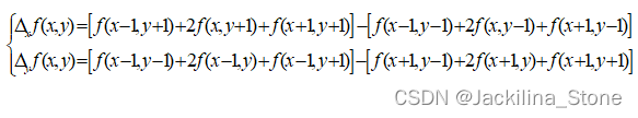 Prewitt边缘检测算子就是一种利用局部差分平均方法寻找边缘的算子。用差分代替一阶偏导可得算子如以下公式所示。