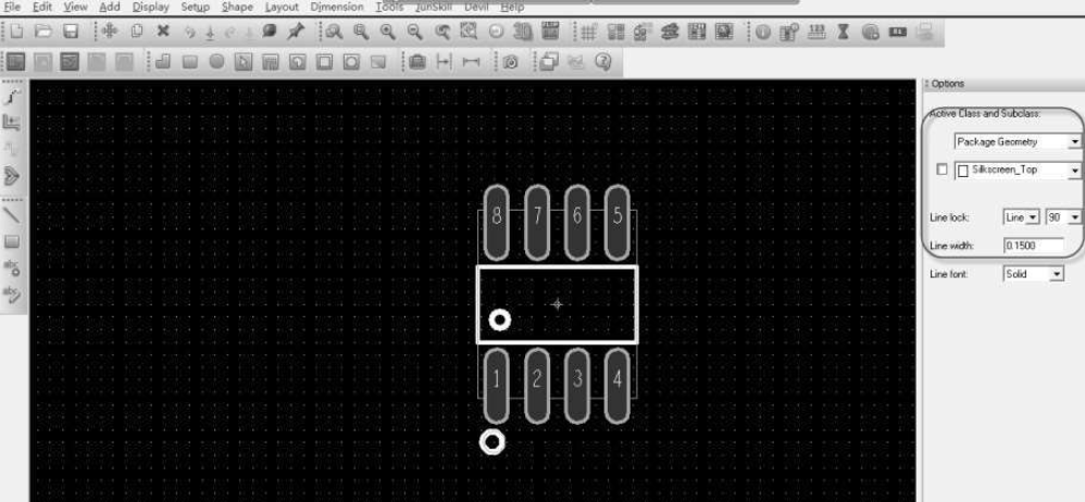 第八步,画上丝印框和1管脚标识,丝印线宽4mil以上(一般用0.15mm或者0.2mm),如图4-11所示。