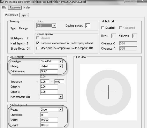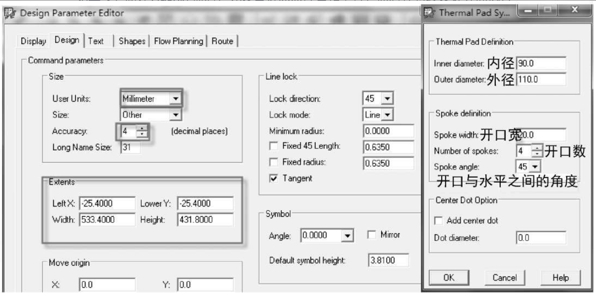 第三步,设置后单击“OK”按钮。一般可以设置外径比内径大20mil左右,开口宽为孔径的1/4左右但大于8mil,如图4-17所示。