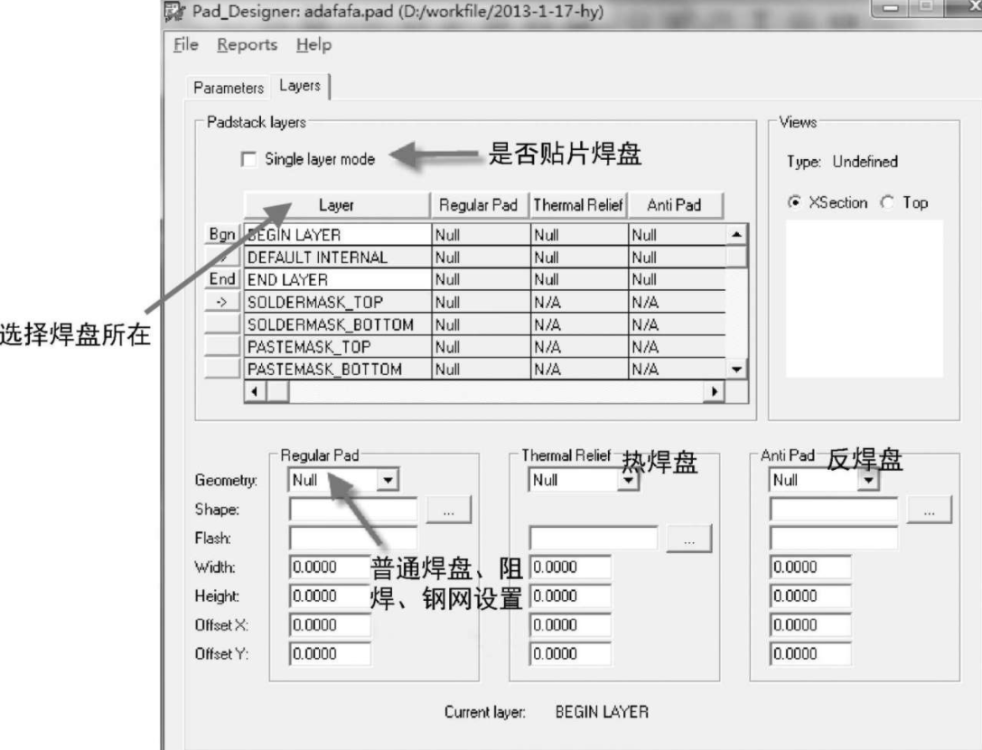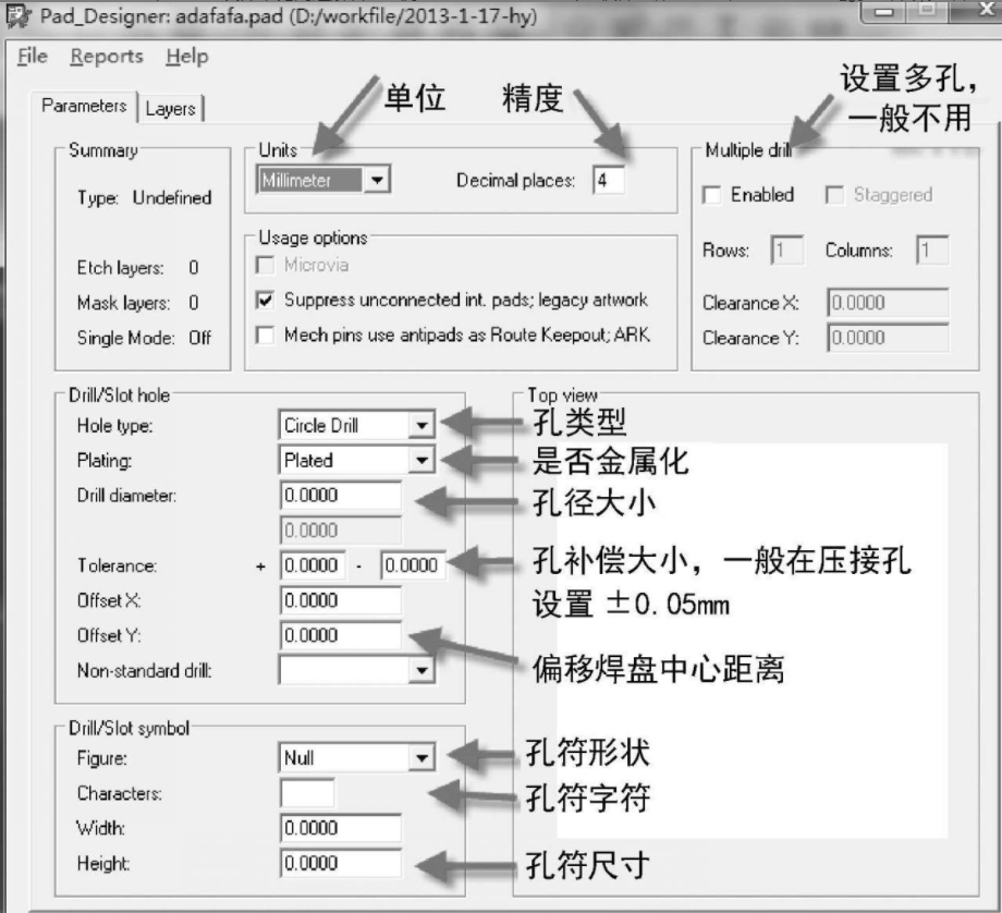 第四步,打开Pad Designer,设置好单位和精度,再按照如图4-18与图4-19所示进行设置,通孔焊盘只需设置孔径大小、孔符、Flash(负片工艺)、Anti Pad(负片工艺)、Regular Pad、Soldermask等。