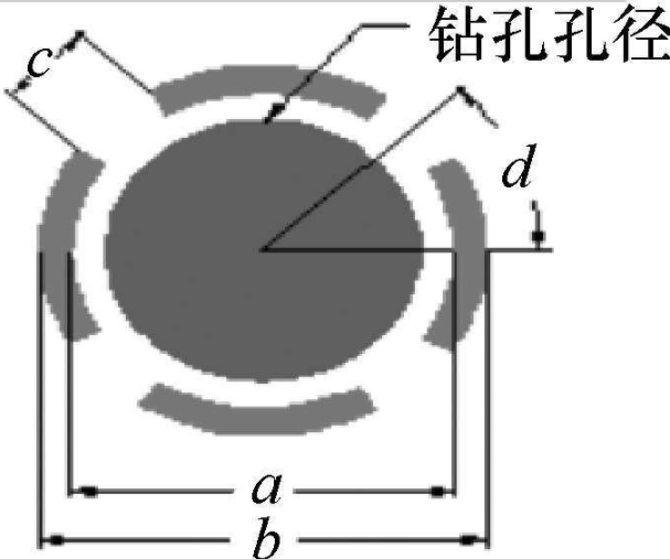 (1)a=钻孔孔径+0.4mm(2)b=钻孔孔径+0.8mm(3)c=0.4mm(4)d=45