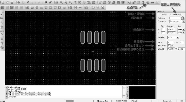 第五步,焊盘建好后,设置好库的路径就可以建封装了。建封装的步骤与贴片封装的过程一样,可参考贴片封装制作过程,如图4-20所示。需要注意的是,如果封装中有非金属化孔(Non Plated),那么就要为非金属化孔添加禁布区,禁布区大小单边(半径)比孔大0.3mm以上。