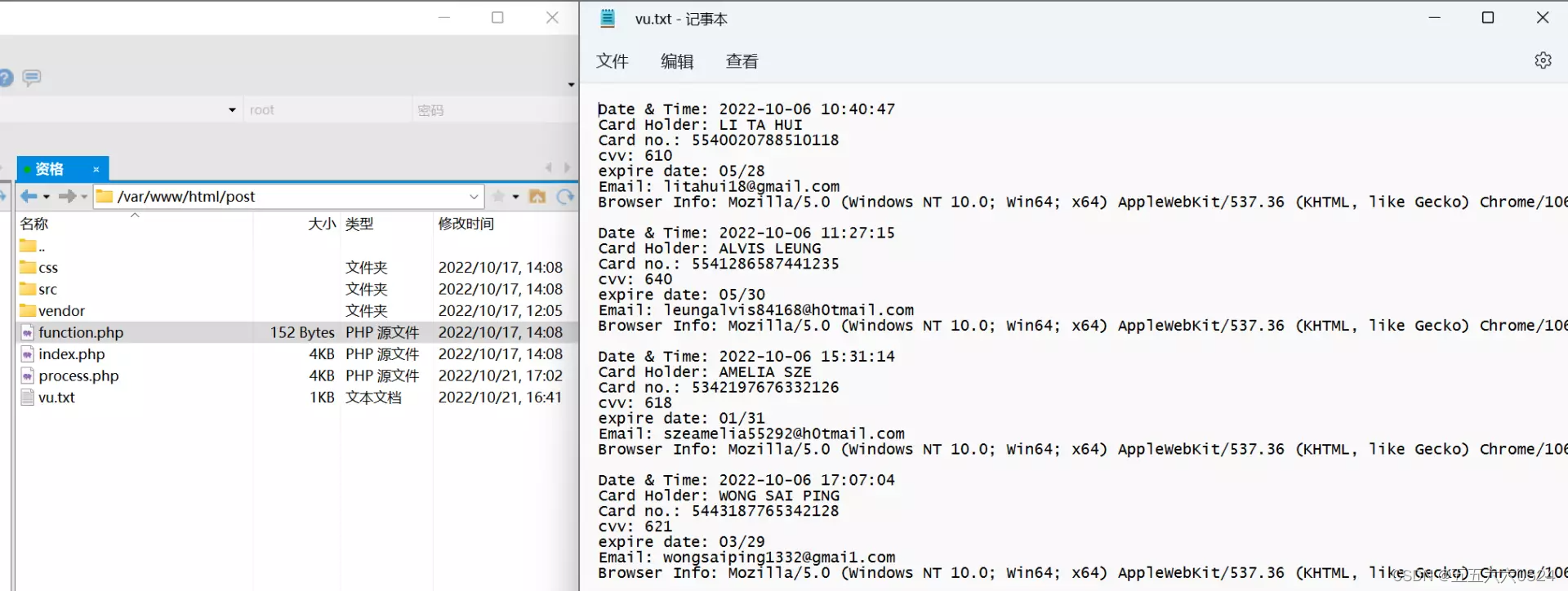 查看vu.txt中已经收集到的信息,会收集受害人输入数据的时间、持卡人姓名、信用卡号码、信用卡安全码、信用卡到期时间、电邮地址、浏览器信息