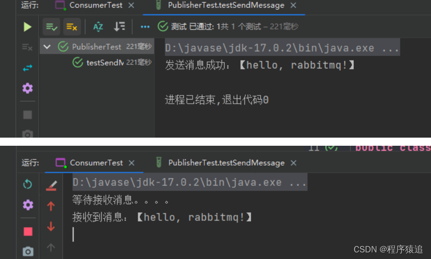 public class PublisherTest {@Testpublic void testSendMessage() throws IOException, TimeoutException {// 1.建立连接ConnectionFactory factory = new ConnectionFactory();// 1.1.设置连接参数,分别是:主机名、端口号、vhost、用户名、密码factory.setHost("192.168.71.132"); // 这是虚拟机的ip,这里不同factory.setPort(5672);factory.setVirtualHost("/");factory.setUsername("itcast");factory.setPassword("123456");// 1.2.建立连接Connection connection = factory.newConnection();
