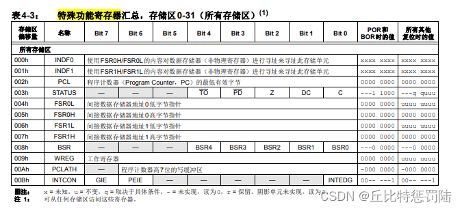 上面这个部分叫做特殊功能寄存器,他们有特定的用途,像PORTA、TRISA就是用来配置IO口端口的,像TCON等等这一类的寄存器是用来与定时器有关的。旁边的这个16进制数就是寄存器的地址。