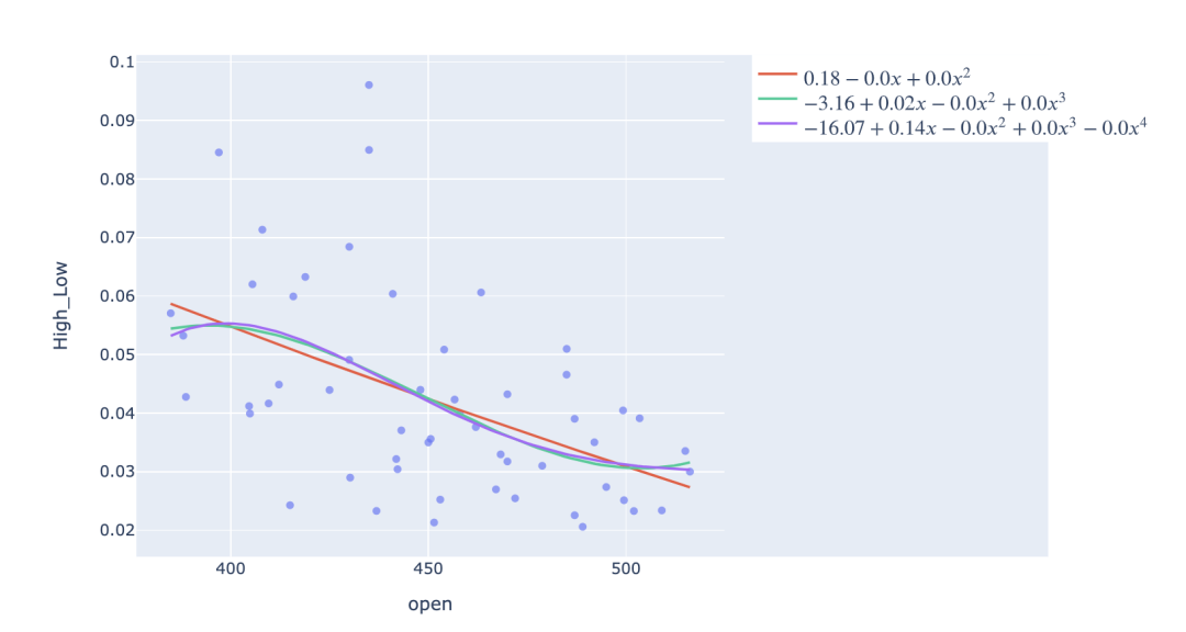 使用Plotly,只需在方程前后添加$符号,就可以在图例和标题中使用$\LaTeX$显示拟合方程,即你可以看到多项式回归拟合的系数。