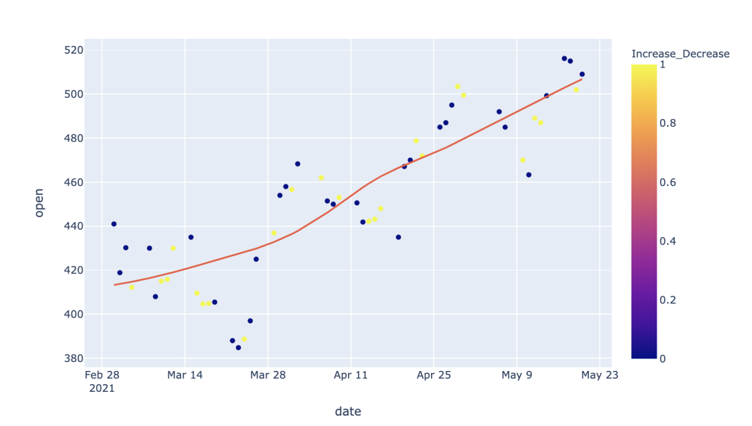 fig = px.scatter(df2, x="date", y="open", color="Increase_Decrease", trendline="lowess")