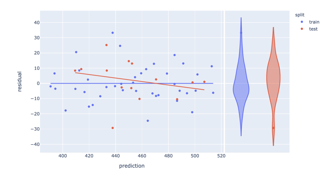 就像预测误差图一样,使用plotly很容易在几行代码中可视化预测残差。即在常规的散点图中设置预测参数trendline='ols'及预测残差参数marginal_y='violin',并以小提琴的图形展示出来。