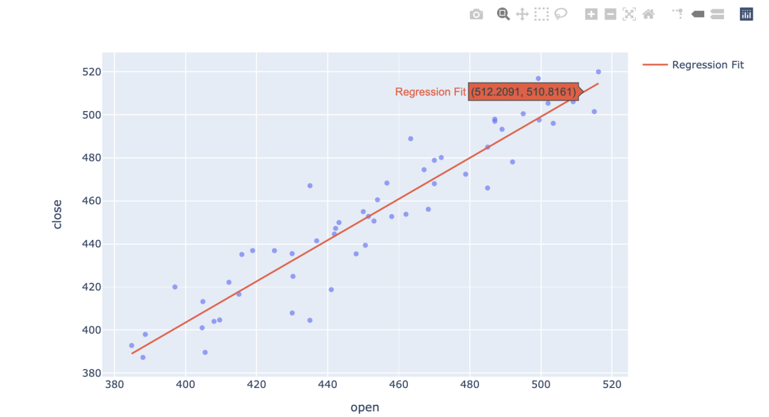 可以使用Scikit-learn的线性回归执行相同的预测。与直接用plotly.express拟合普通最小二乘回归不同,这是通过散点图和拟合线组合的方式绘制图形,这会更加灵活,除了添加普通线性回归拟合曲线,还可以组合其他线性回归曲线,即将拟合结果很好地可视化出来。