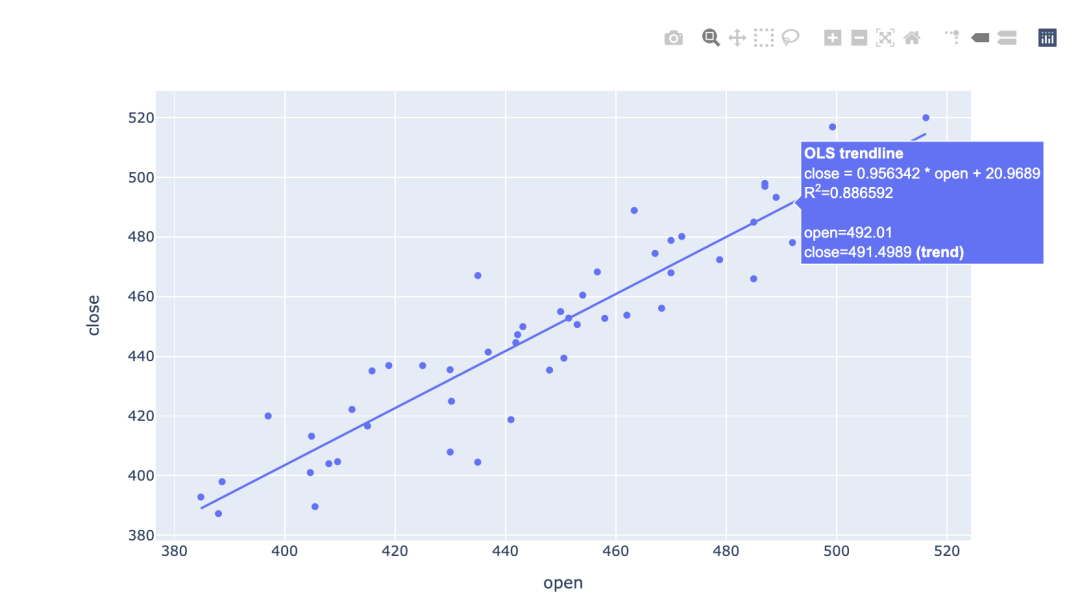 与seaborn类似,plotly图表主题不需要单独设置,使用默认参数即可满足正常情况下的使用,因此一行代码并设置参数trendline="ols"即可搞定散点图与拟合线的绘制,非常方便。