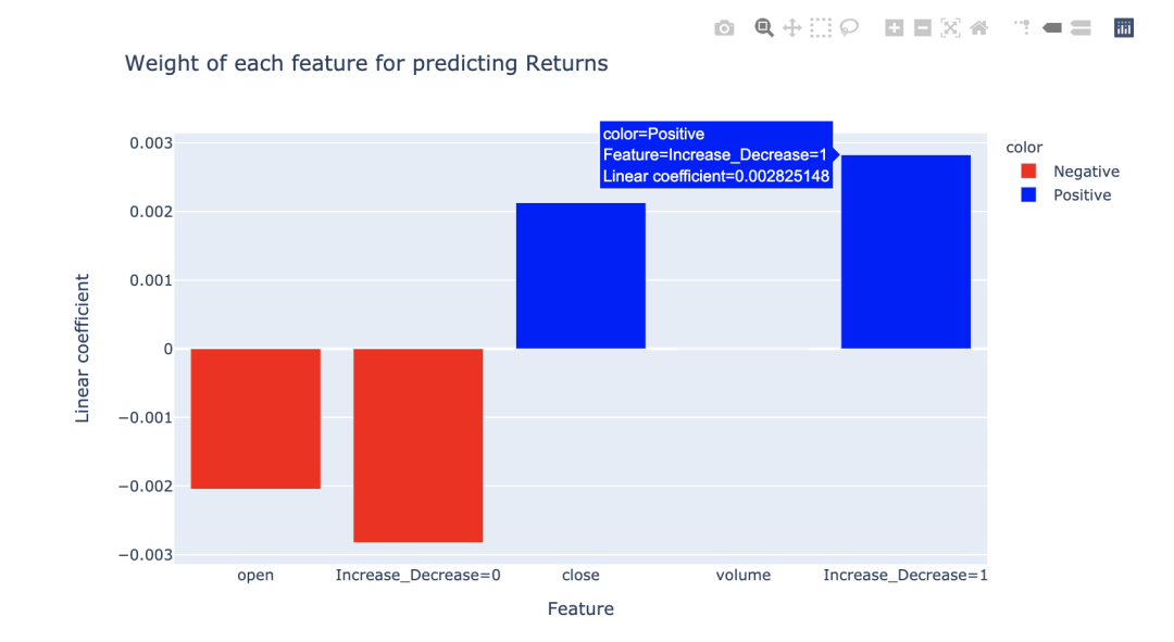 fig = px.bar( x=X.columns, y=model.coef_, color=colors, color_discrete_sequence=['red', 'blue'], labels=dict(x='Feature', y='Linear coefficient'), title='Weight of each feature for predicting Returns'