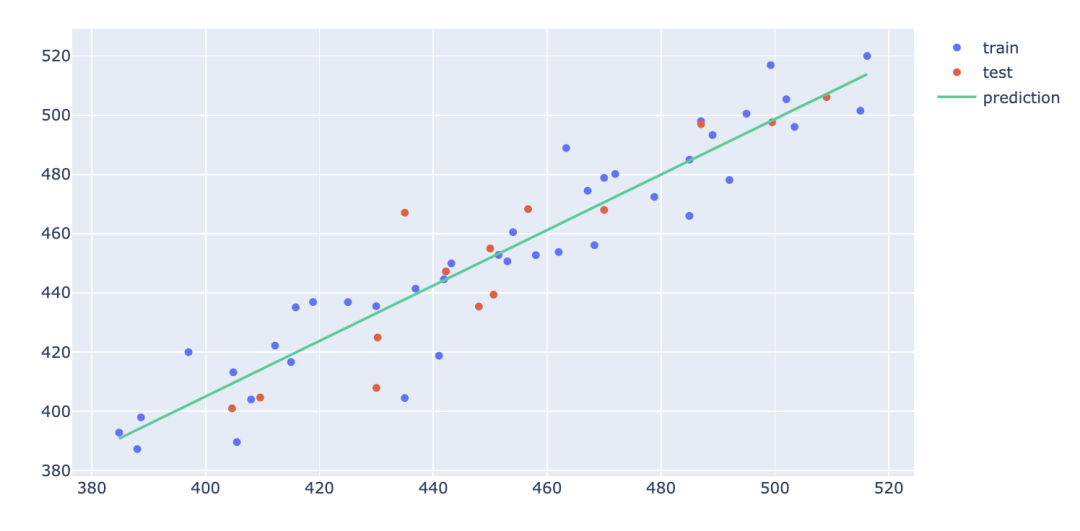 利用plotly可视化查看模型泛化能力,即需要比较模型分别在训练集与测试集上的拟合状况。这里使用Scatter绘图,可以通过用不同的颜色着色训练和测试数据点,将训练集与测试集数据及拟合线绘制在同一张画布上,即可很容易地看到模型是否能很好地拟合测试数据。