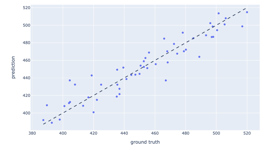 fig.add_shape( type="line", line=dict(dash='dash'), x0=y.min(), y0=y.min(), x1=y.max(), y1=y.max())